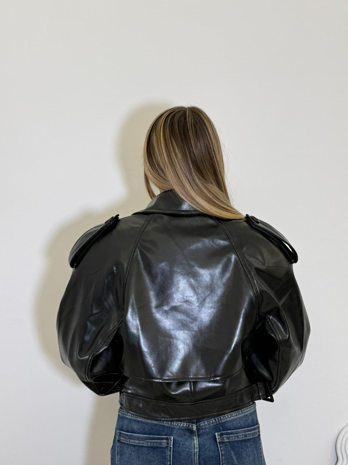 giubbino in ecopelle crop con cerniera sul d'avanti e cintura in vita.
