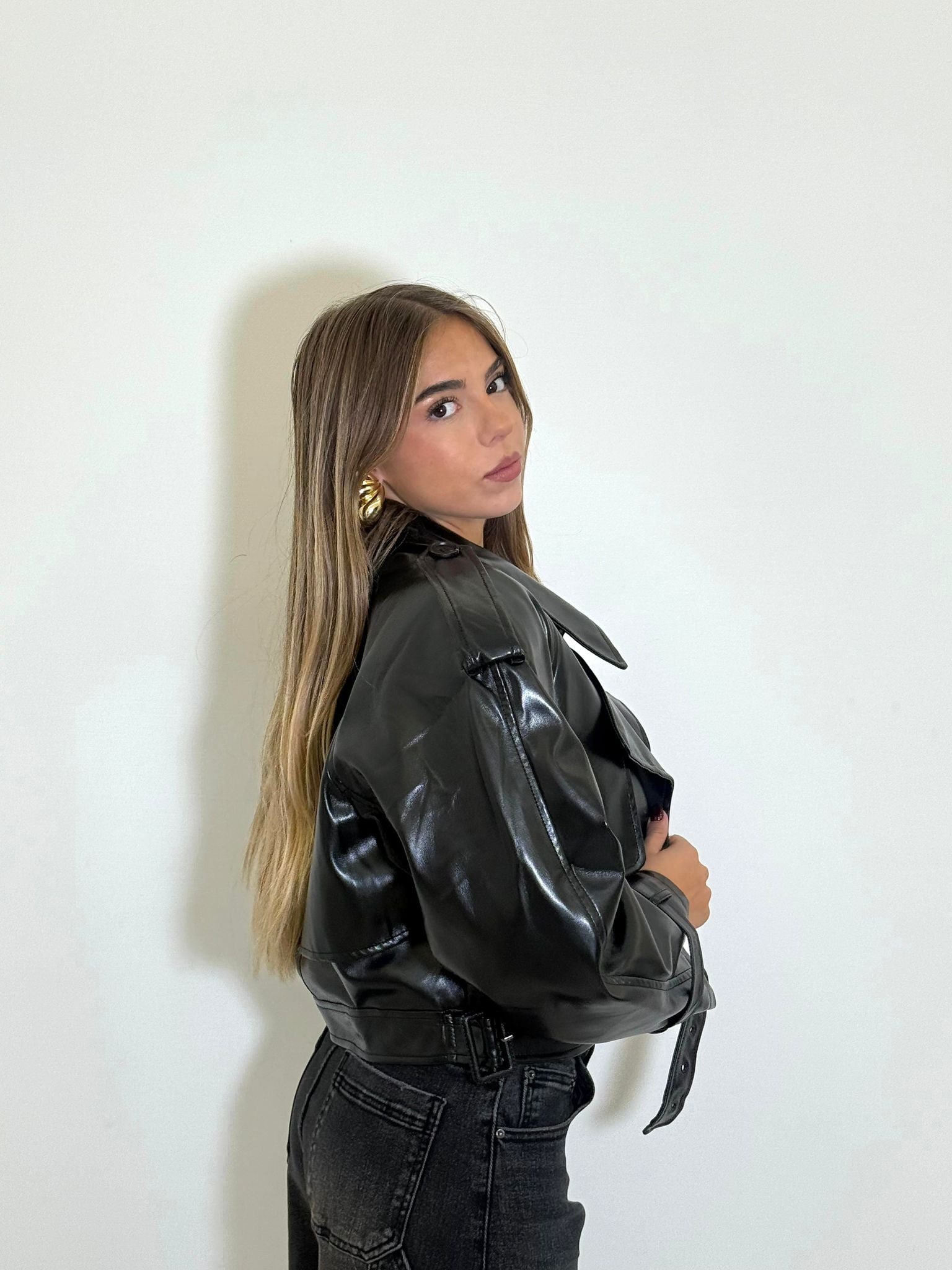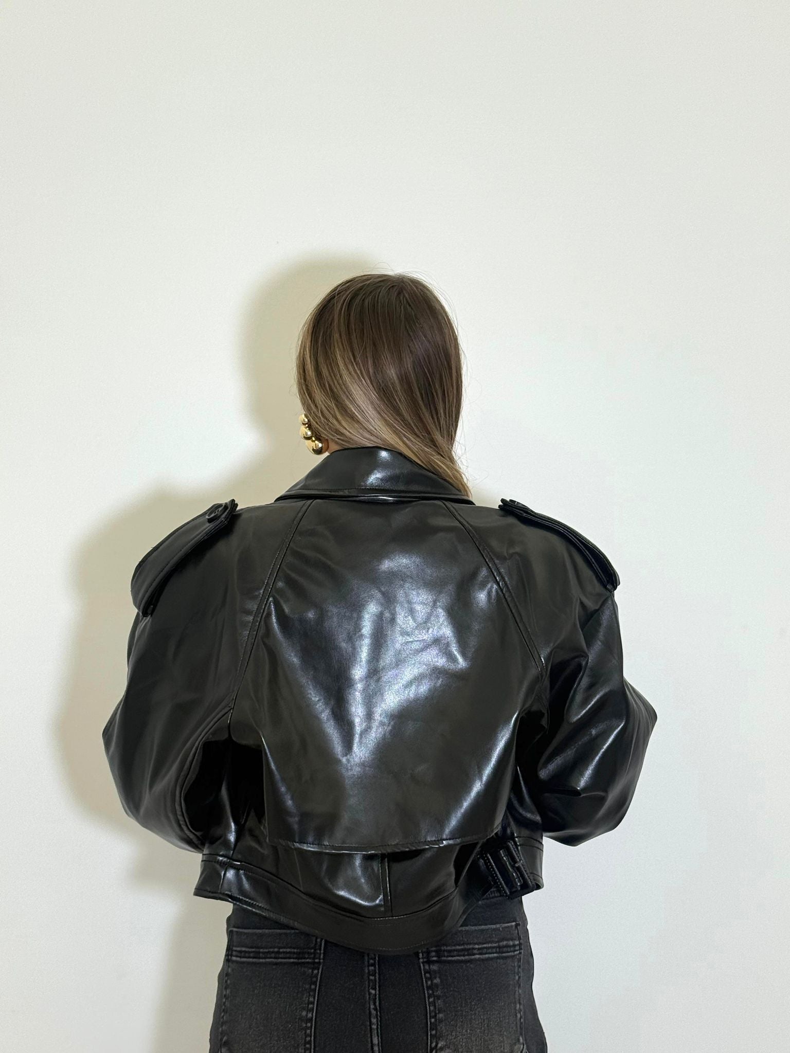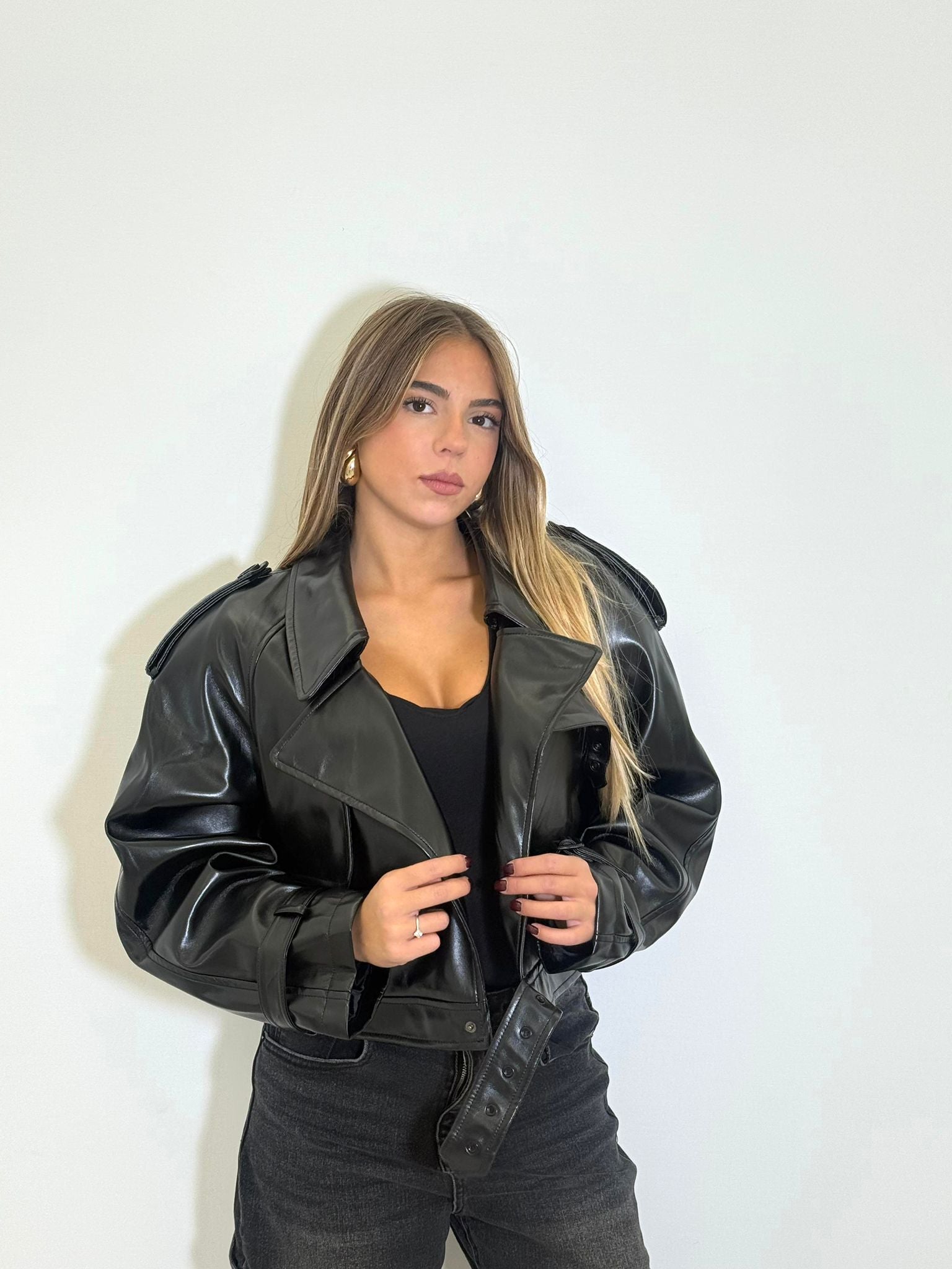 giubbino in ecopelle crop con cerniera sul d'avanti e cintura in vita.