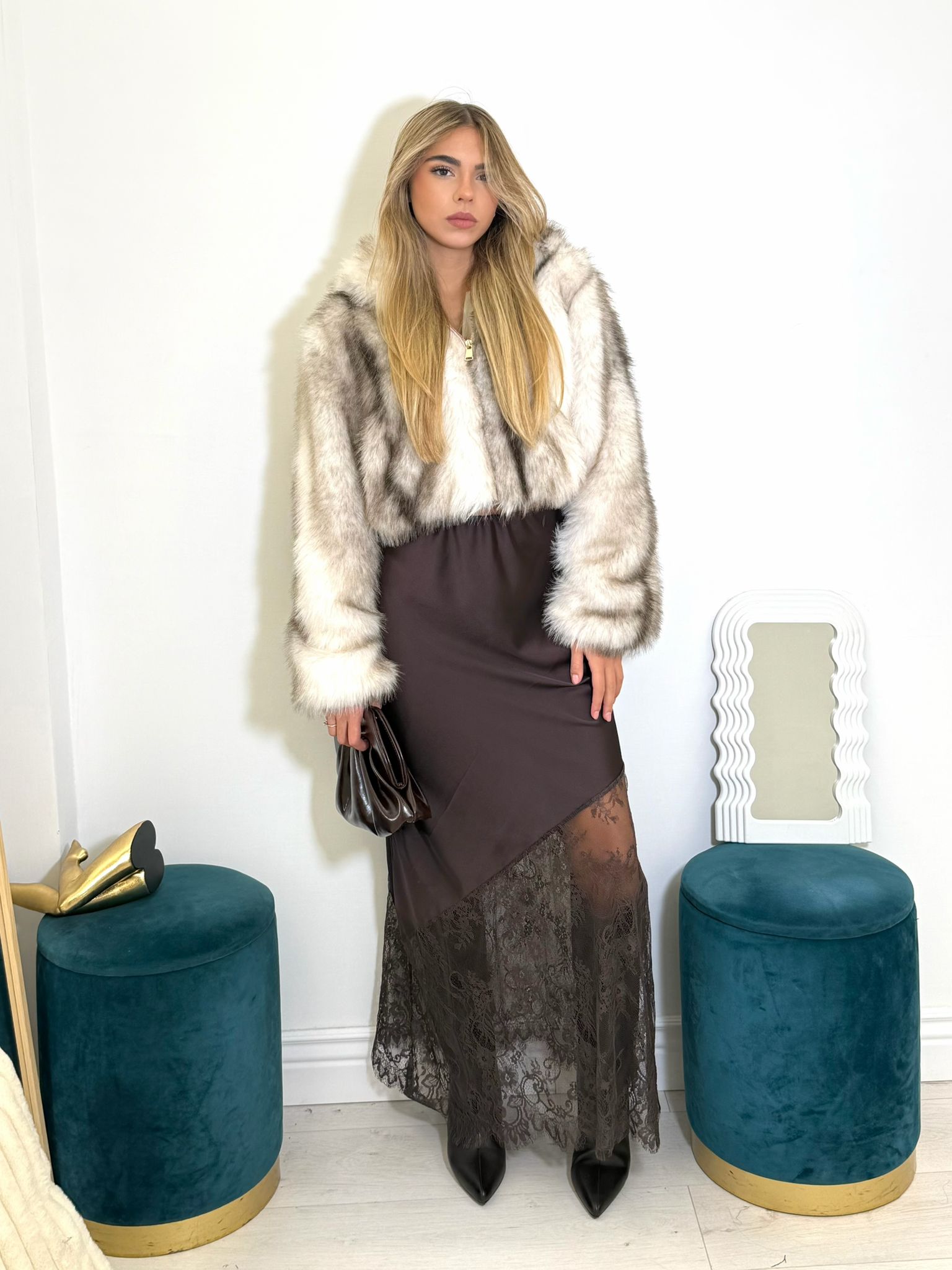 Gonna satin in simil cotone lunga con spacco laterale in pizzo.
