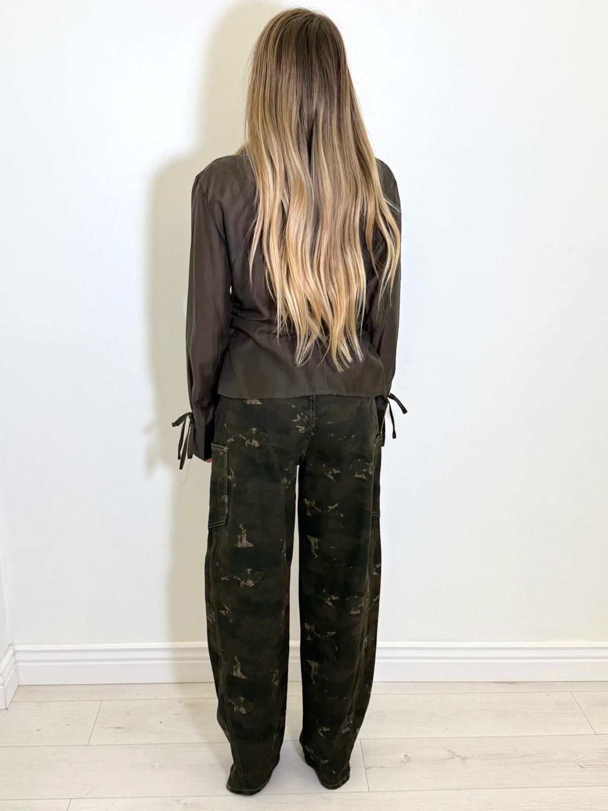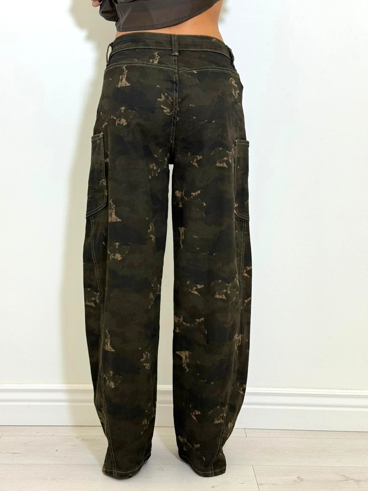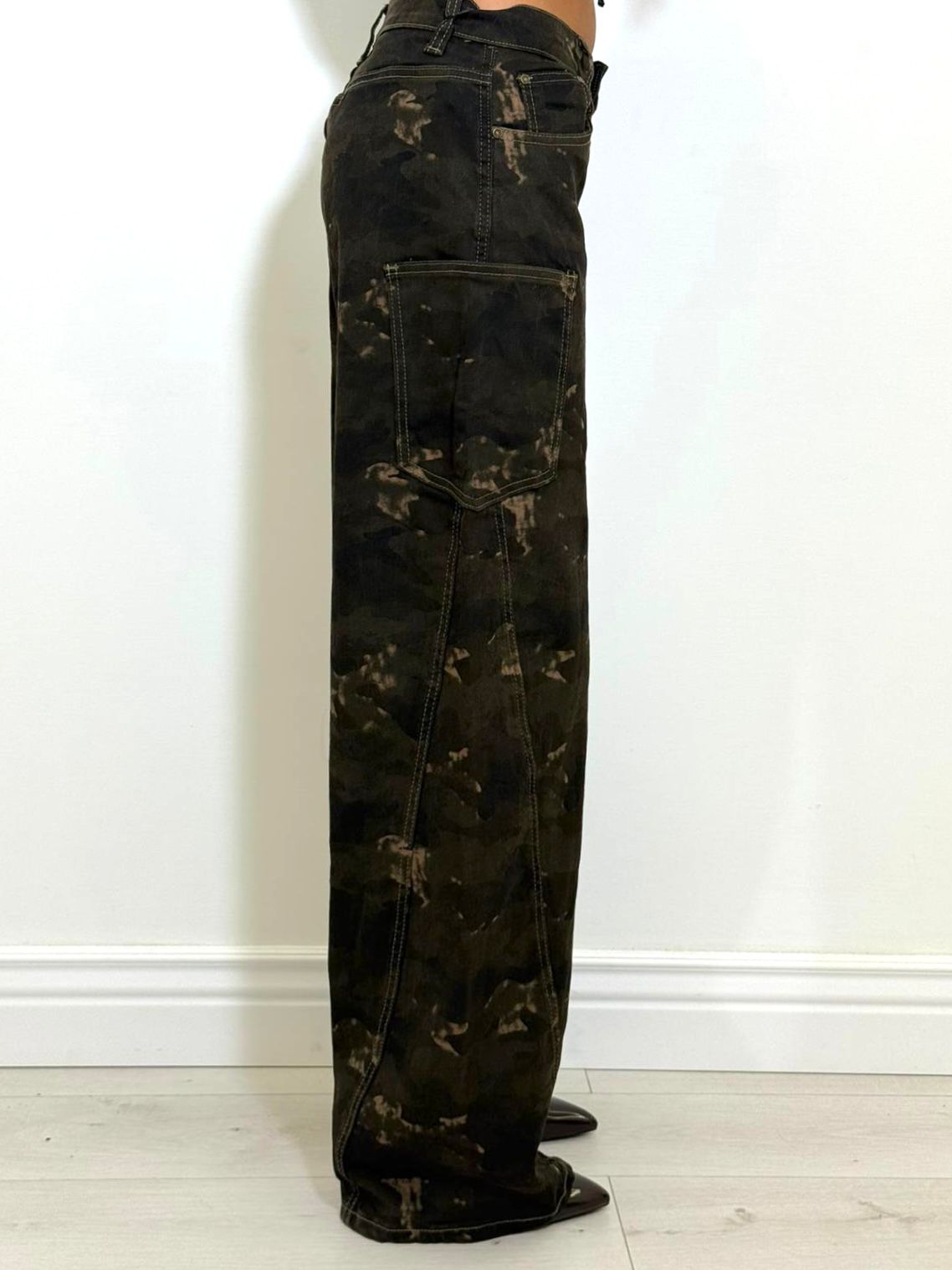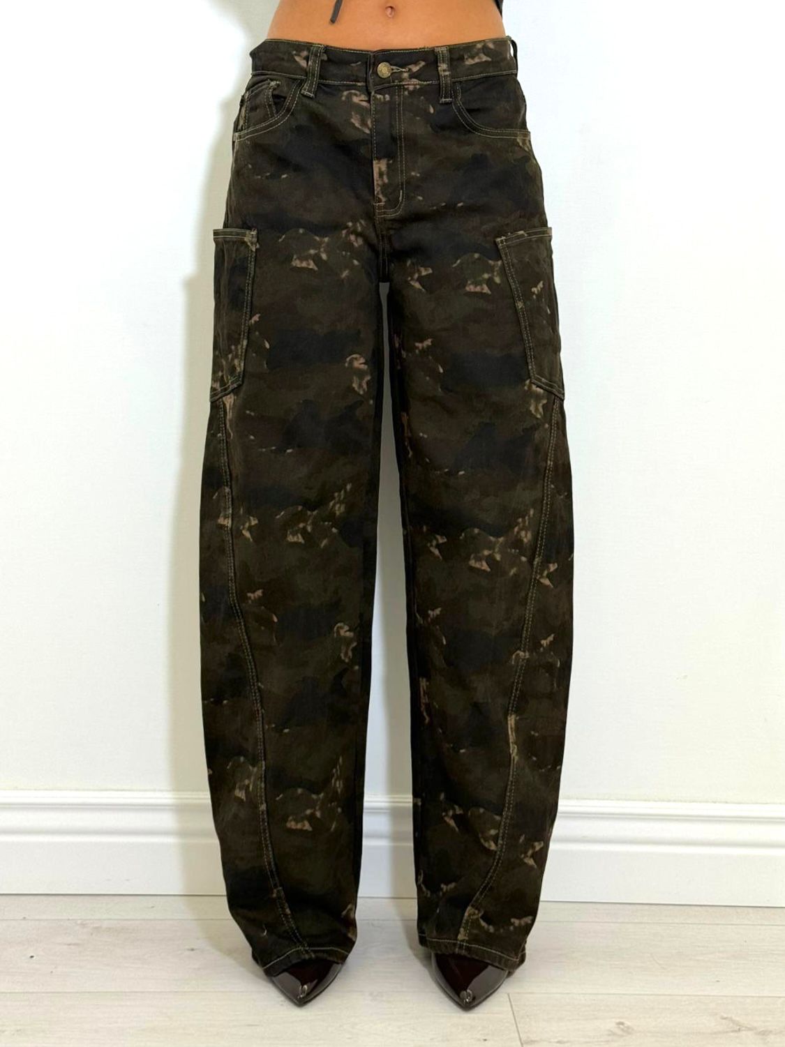 jeans in tela elastica,modello a palazzo con tasche laterali, chiusura con bottone.
