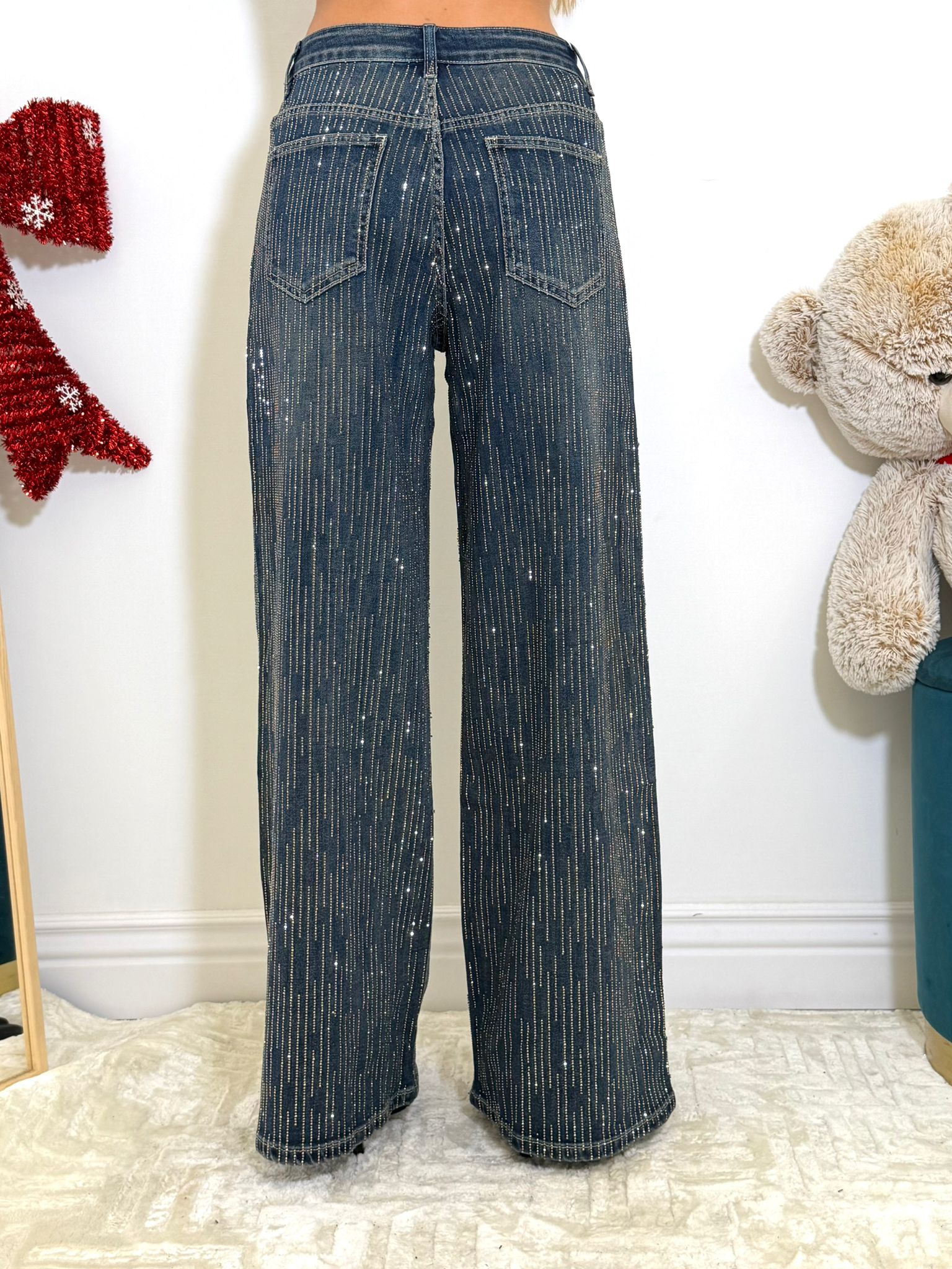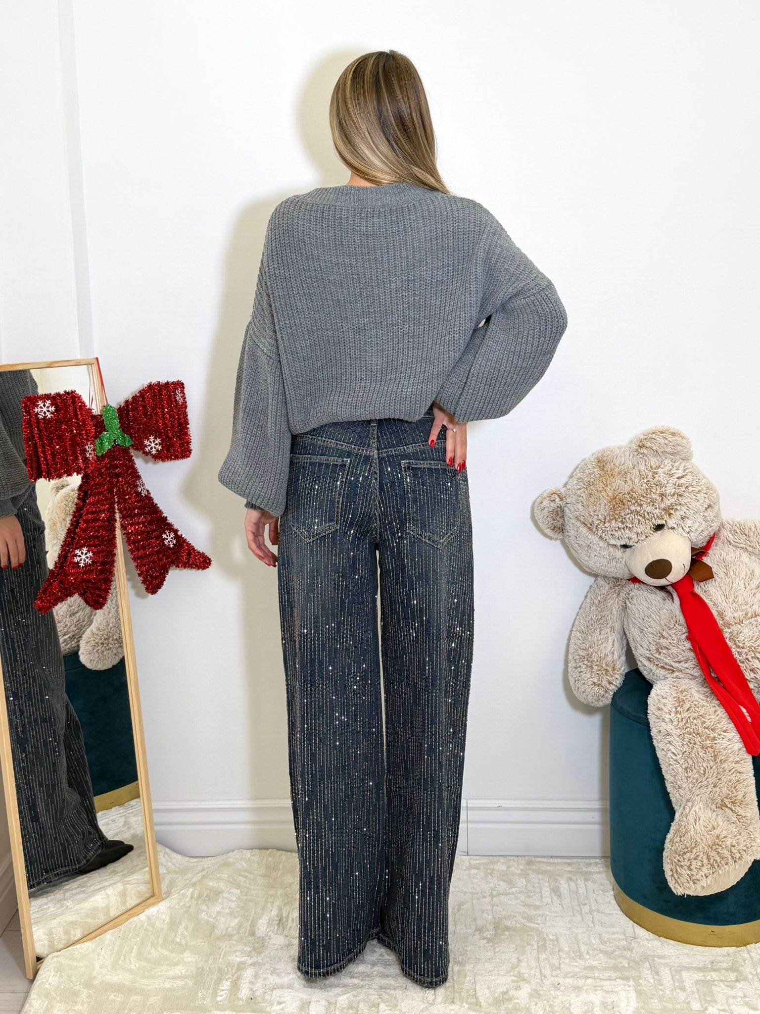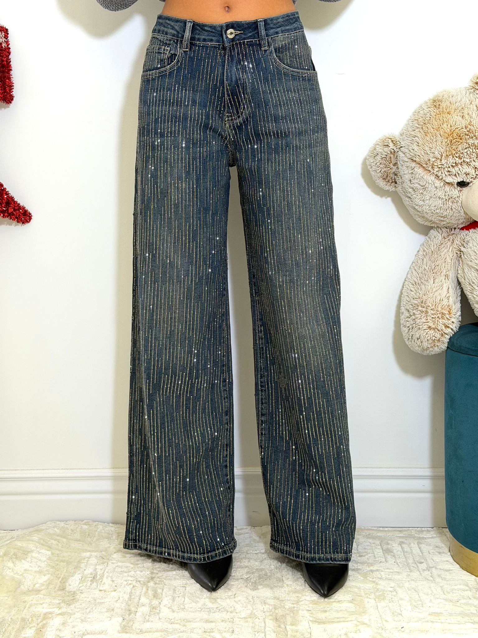 Jeans in tela fissa con pioggia di paillettes, modello a palazzo.