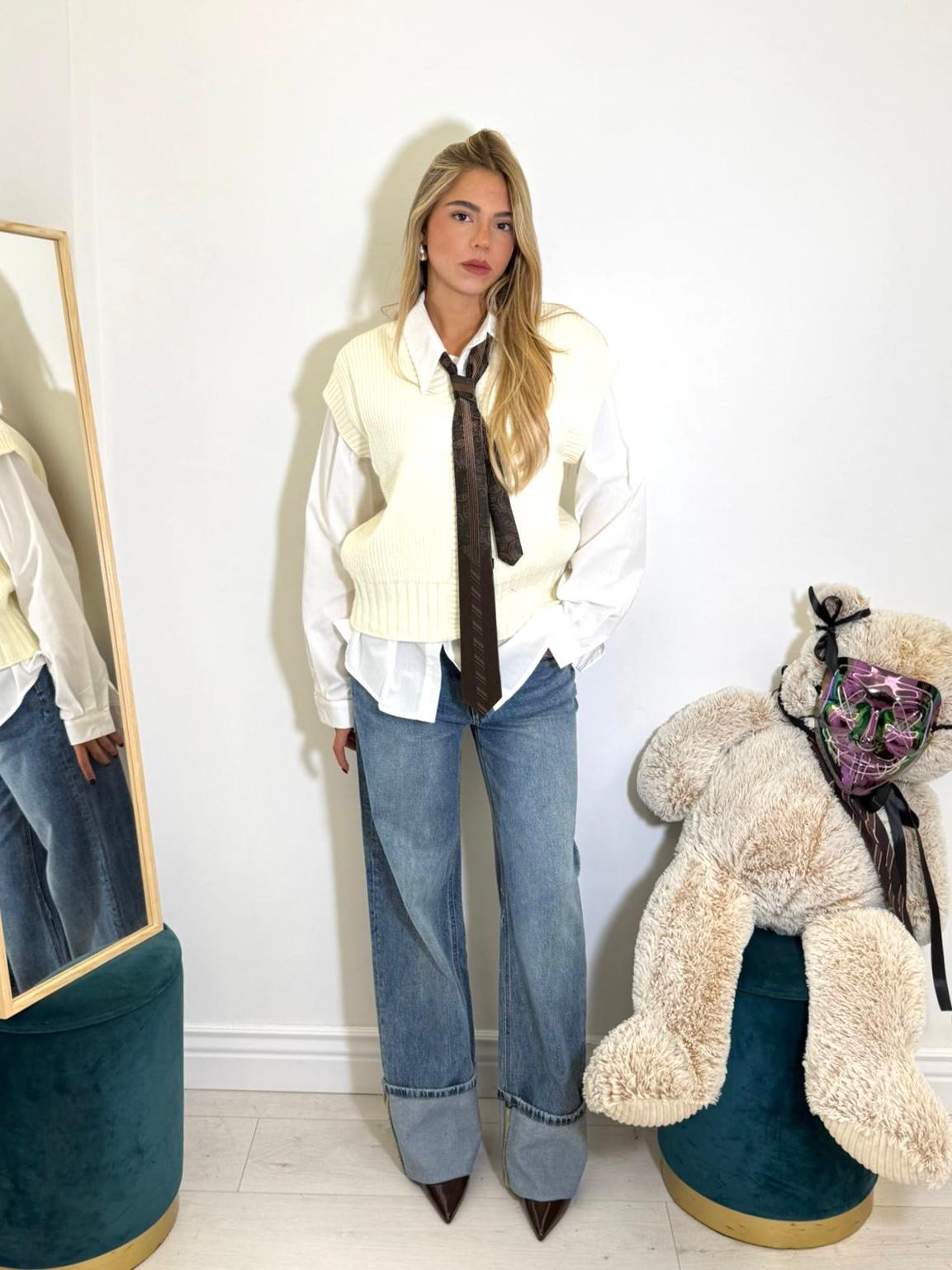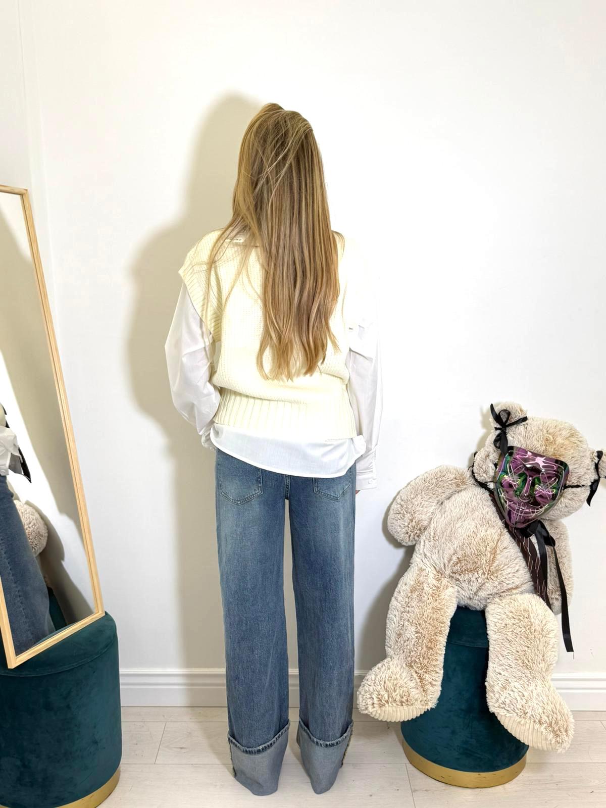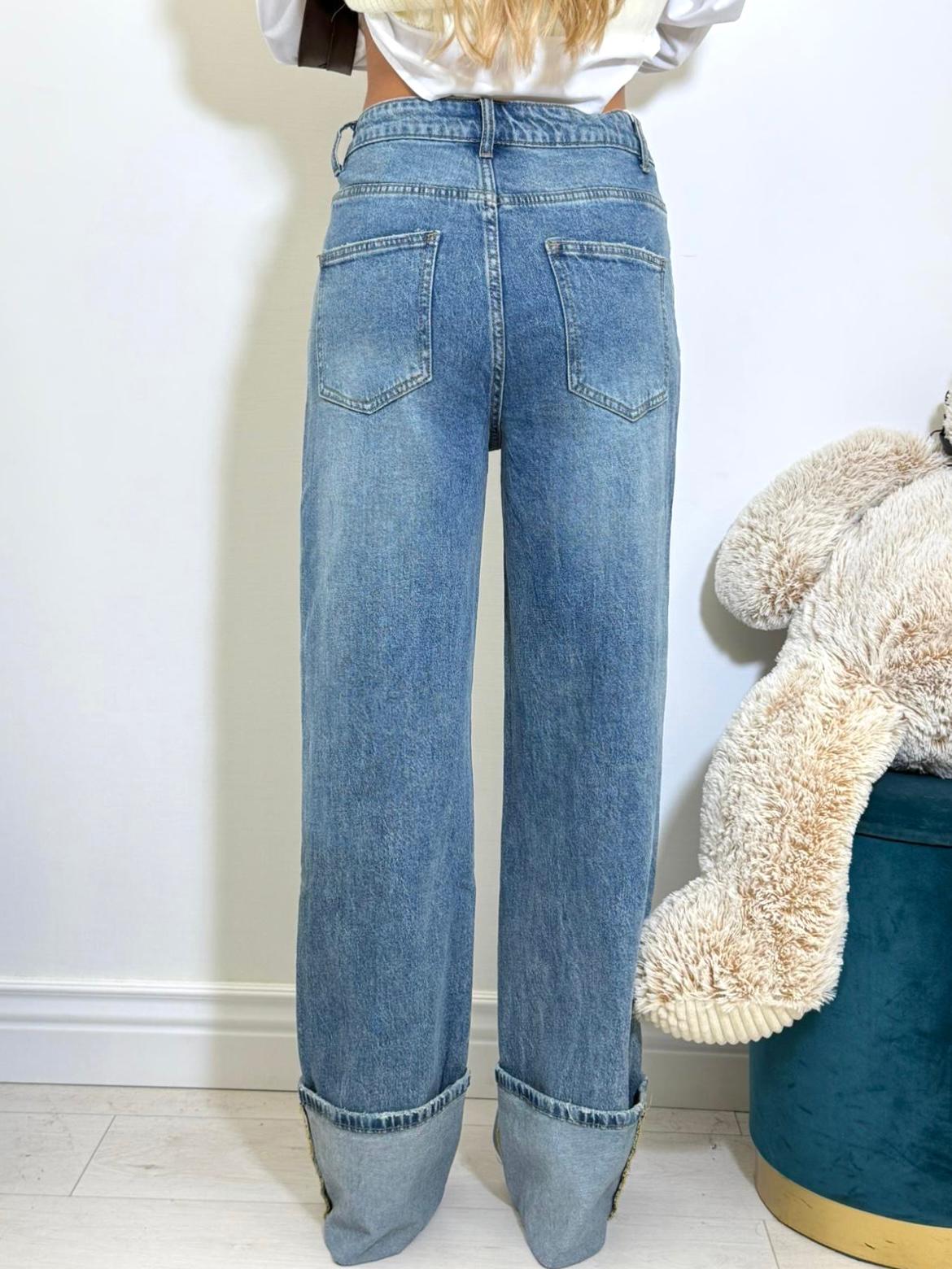 Jeans in tela elastica a gamba dritta con piegoni e chiusura trasversale.