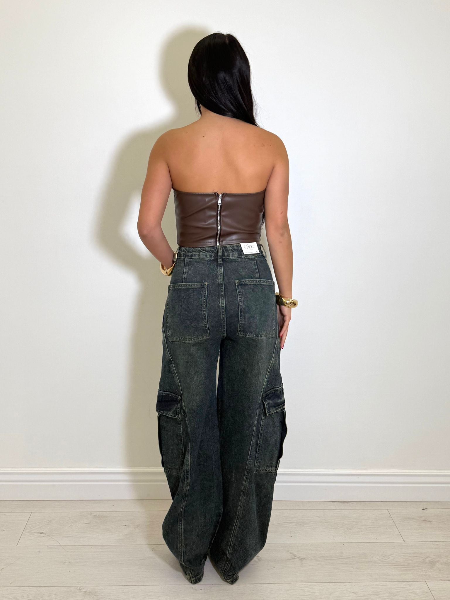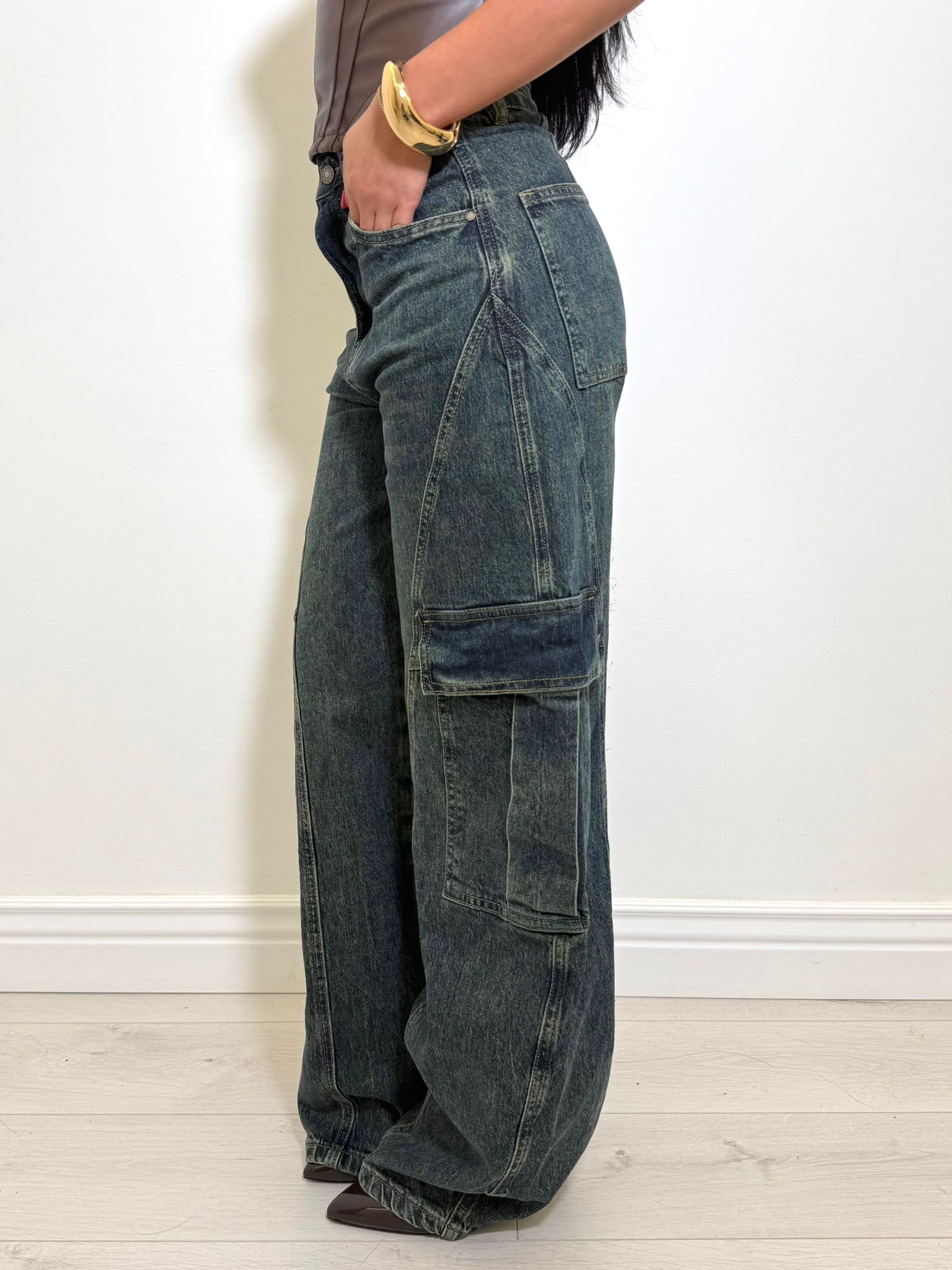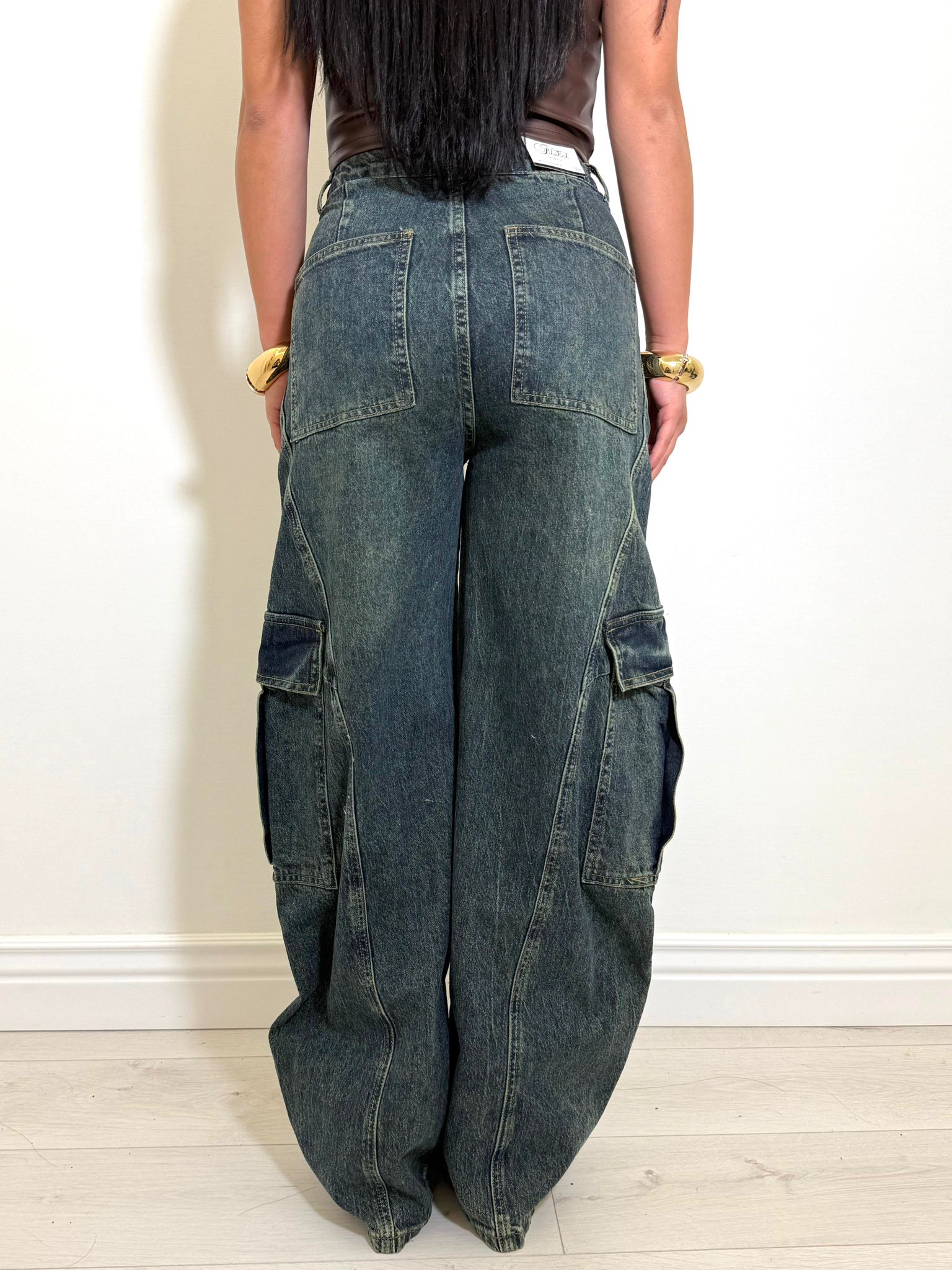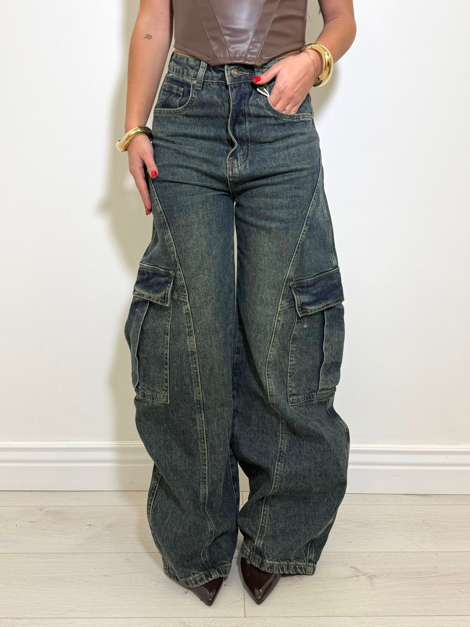 jeans tela elastica, denim scuro, con tasconi, modello balloon.