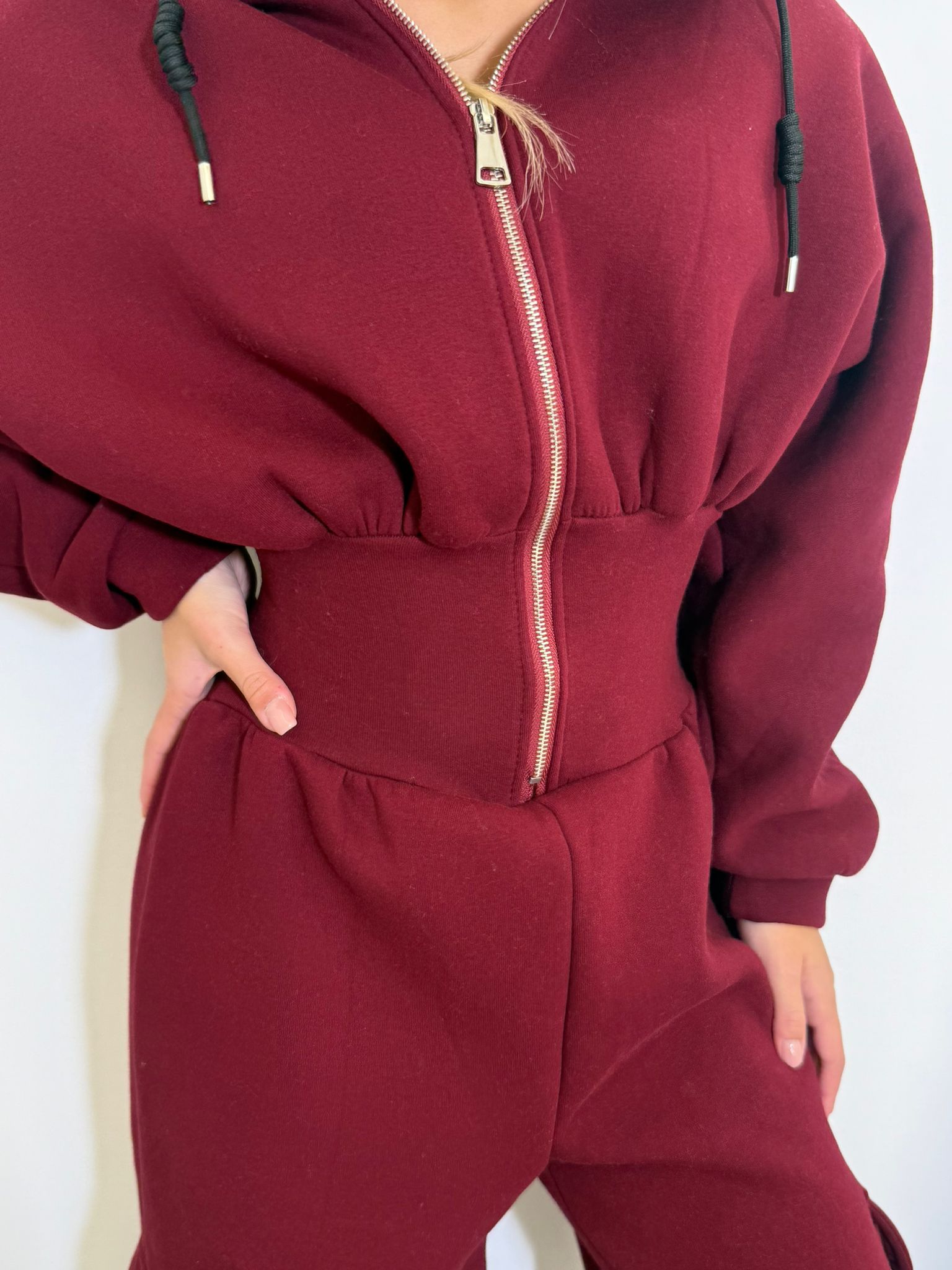 Jumpsuit felpata e imbottita con chiusura zip e cappuccio. Effetto bustier e tasconi laterali sul pantalone.