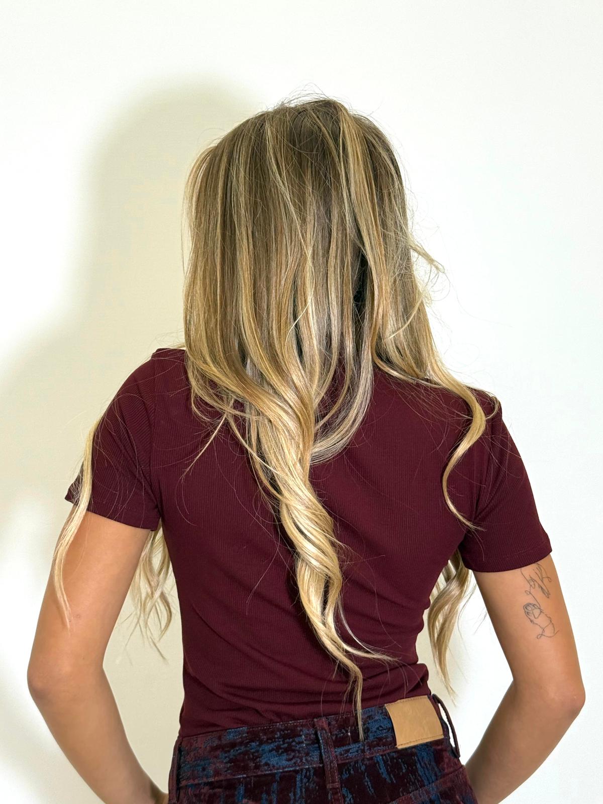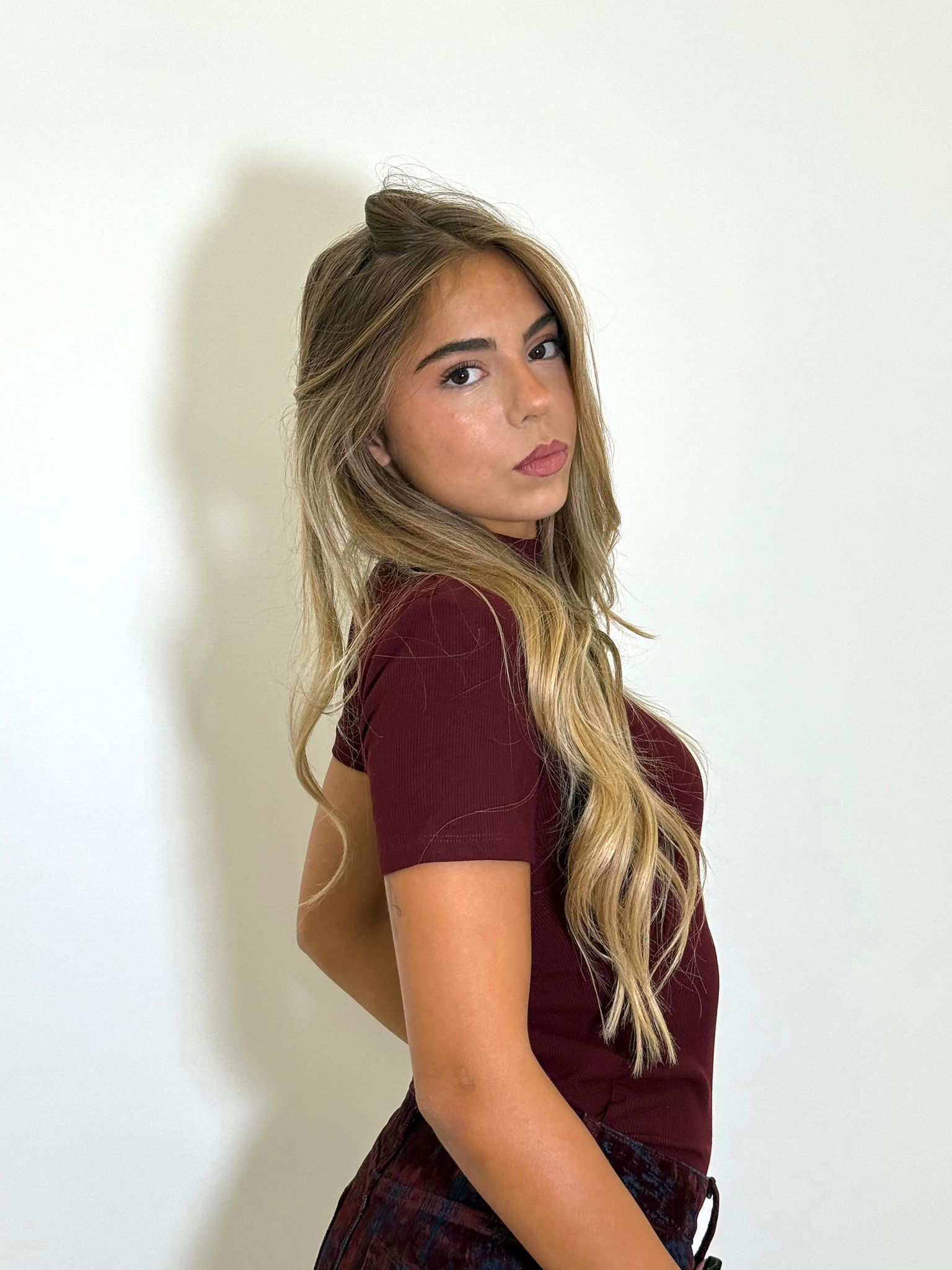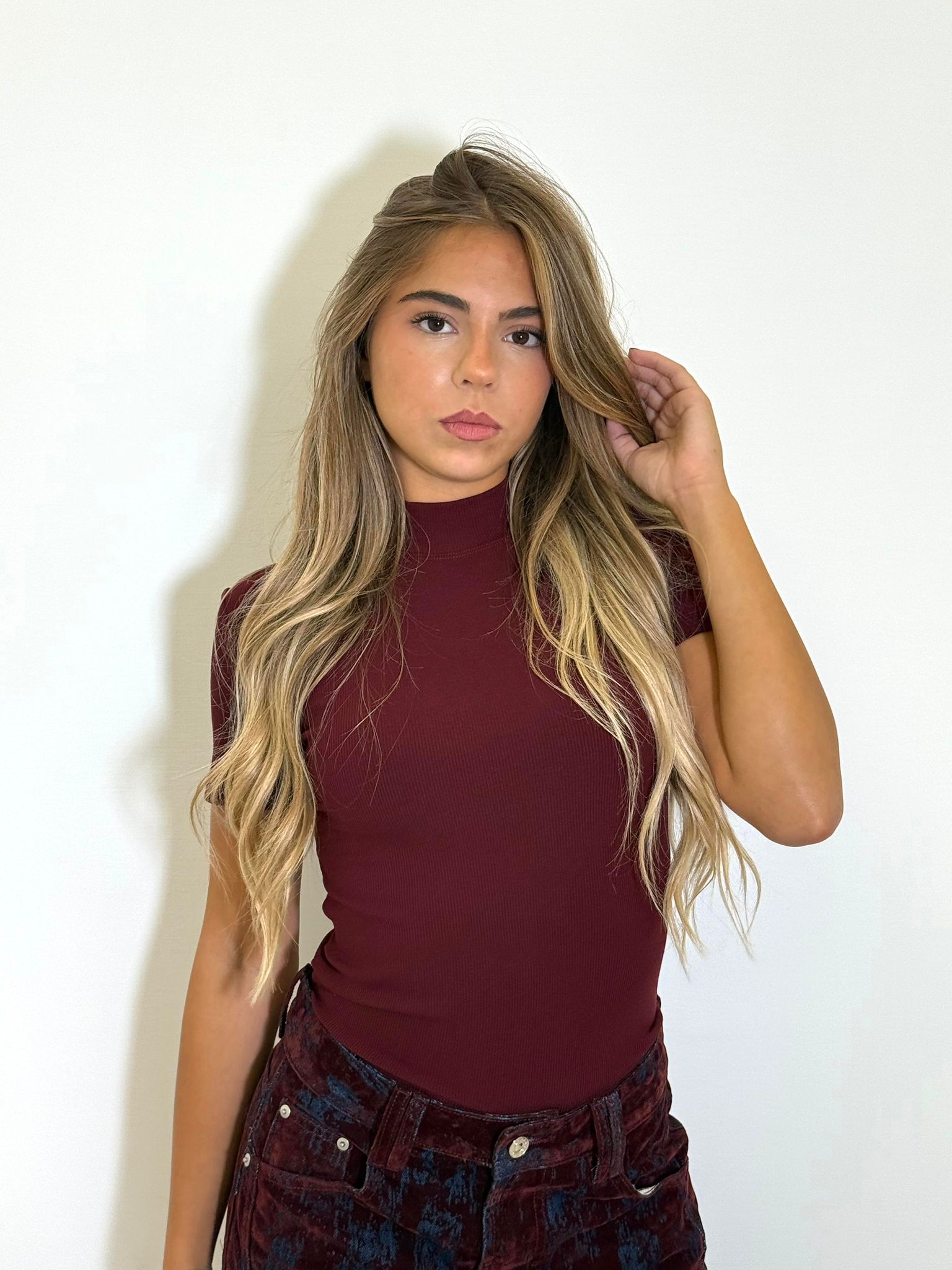 maglia aderente a mezze maniche con colletto, elasticizzata a costine.