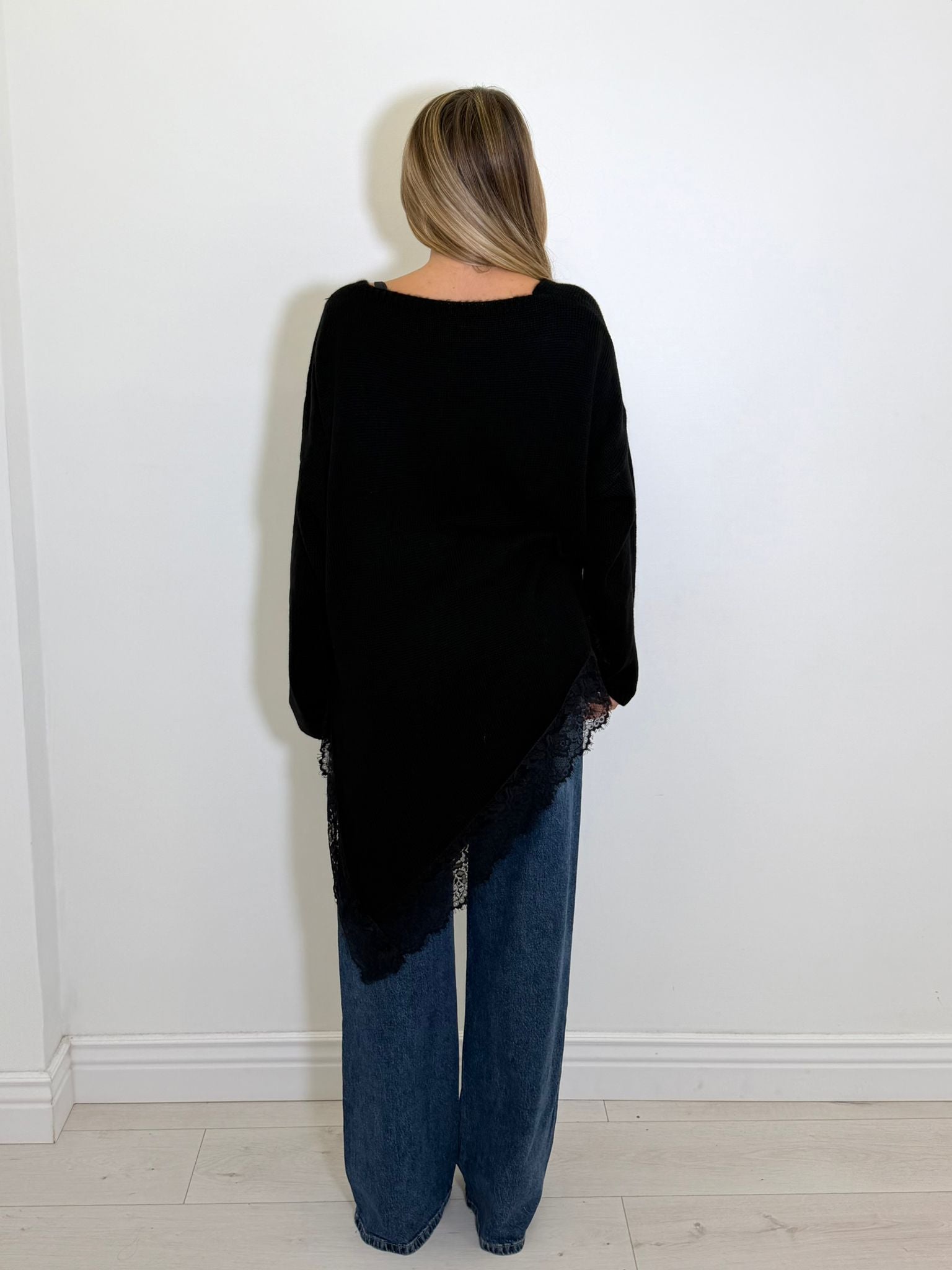 Maglione over in simil lana morbida con scollo a V e con pizzo trasversale.