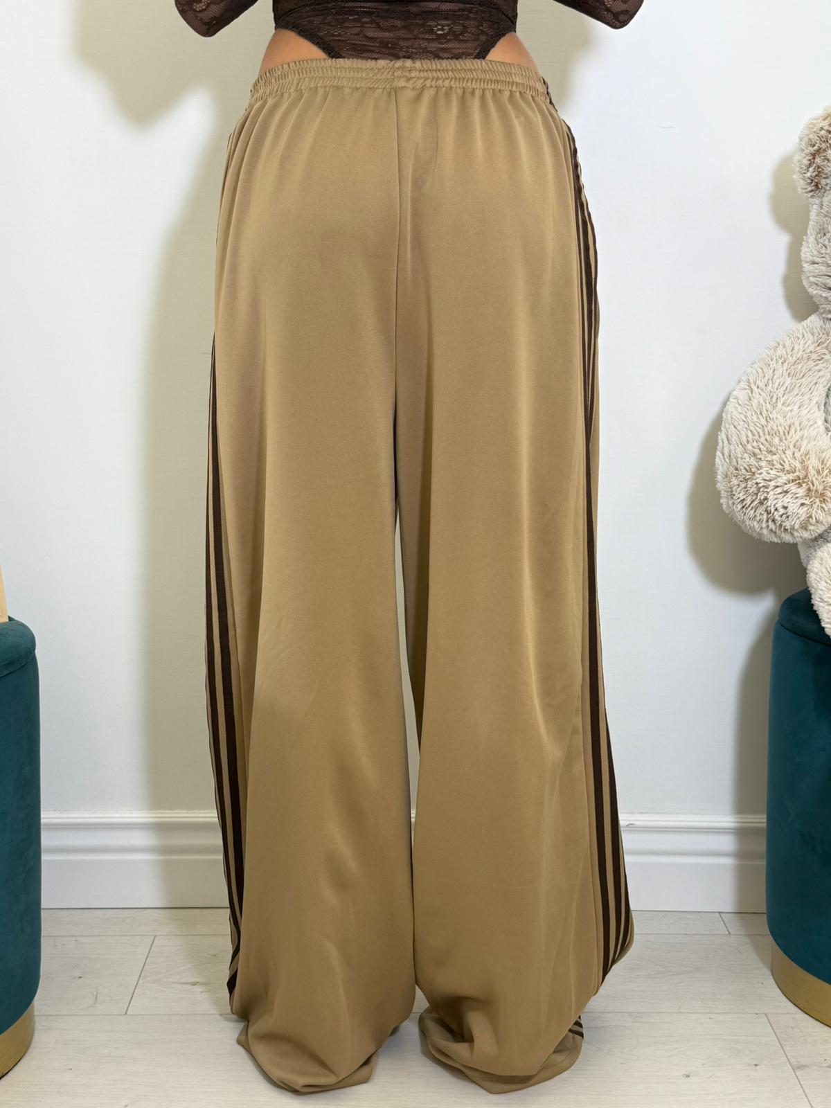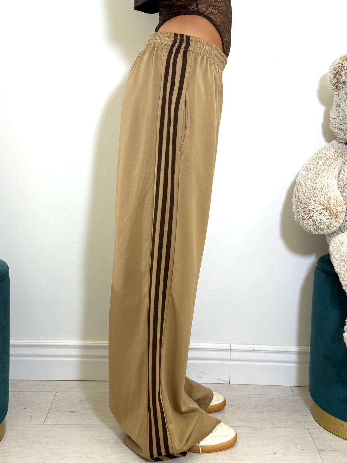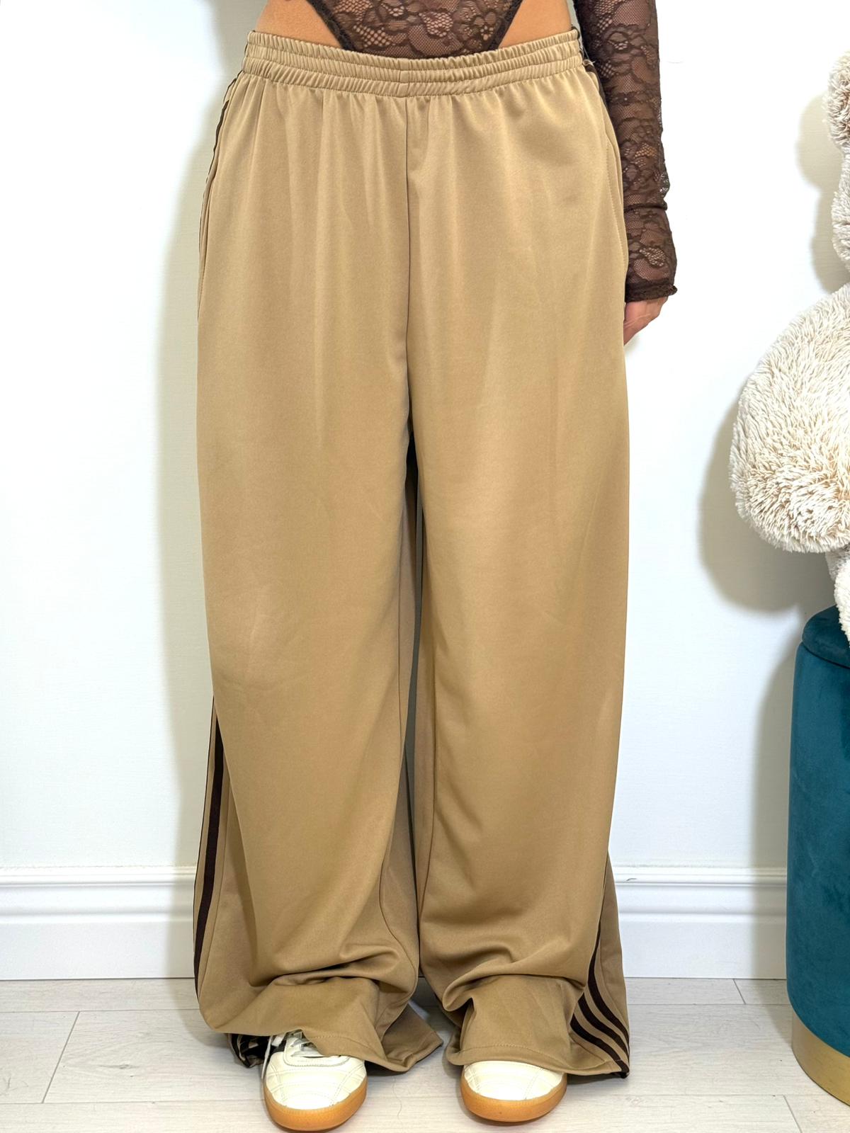 Pantalone in simil cotone, modello gamba larga con strisce laterali.