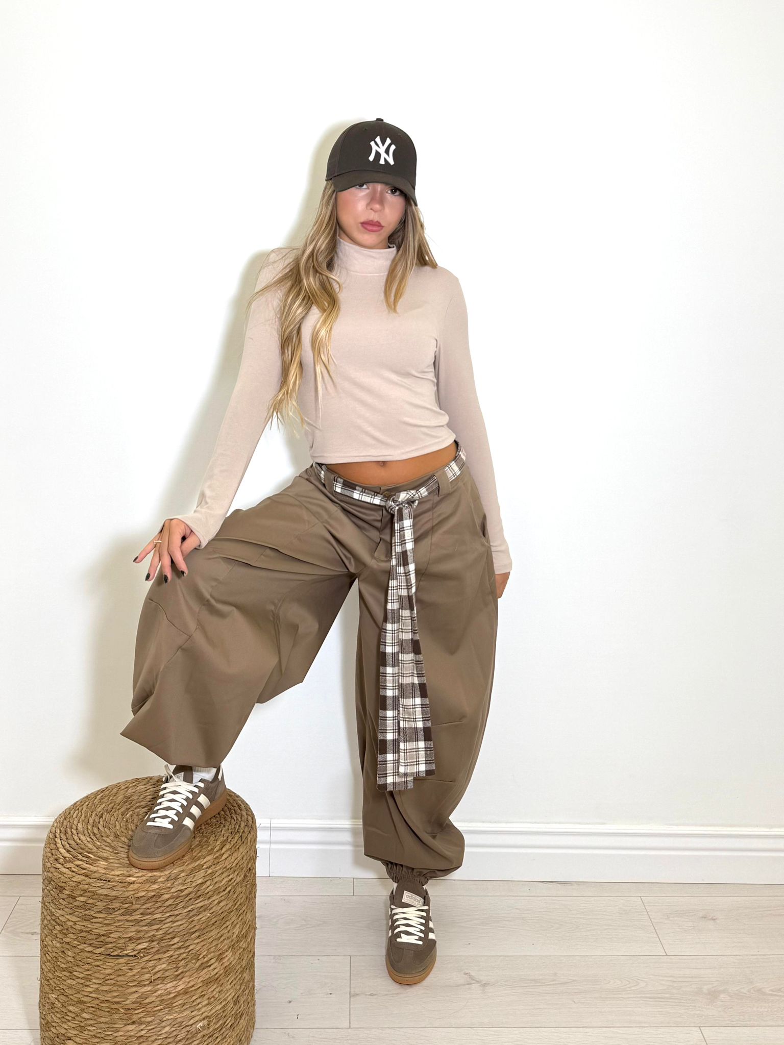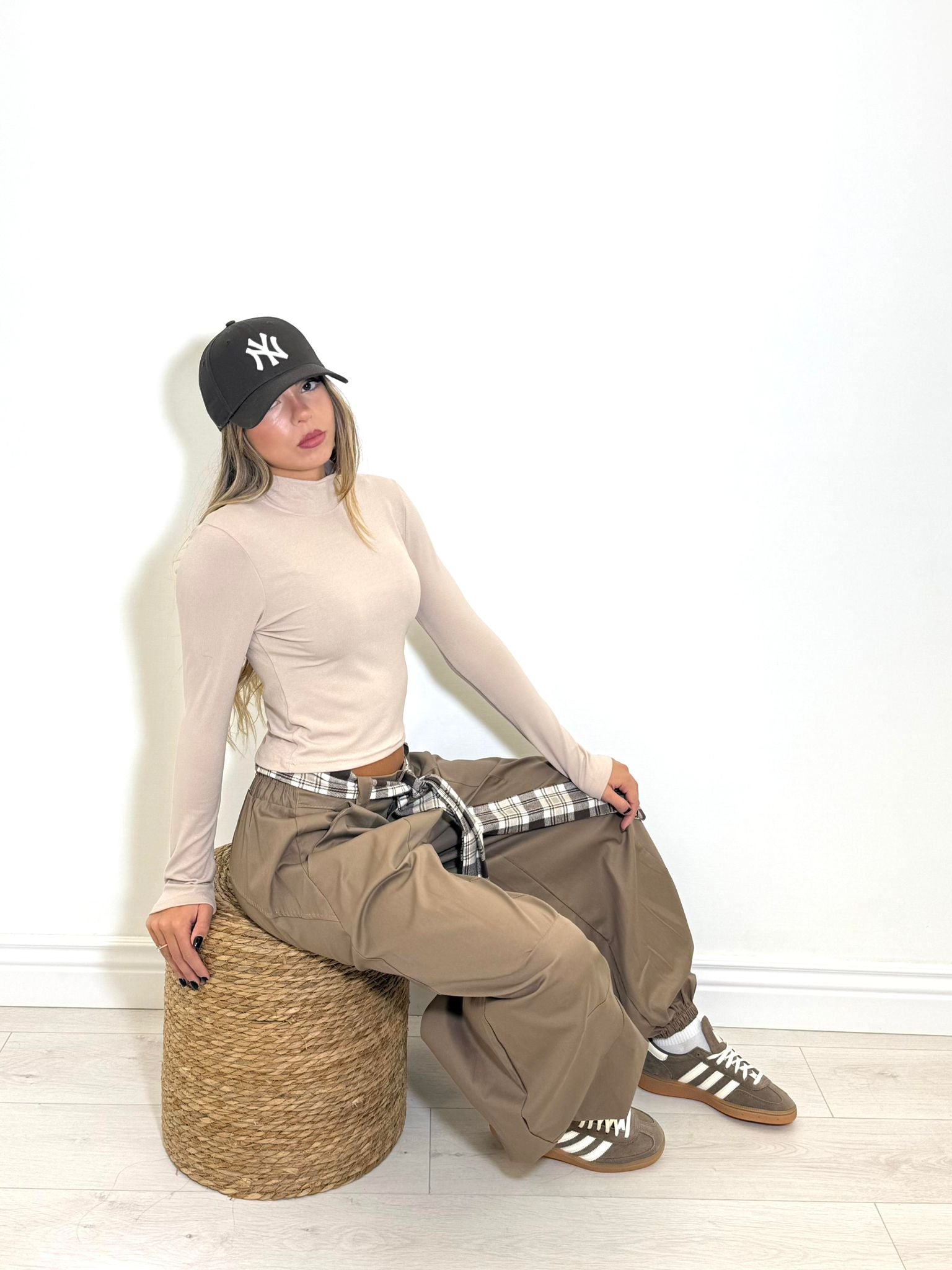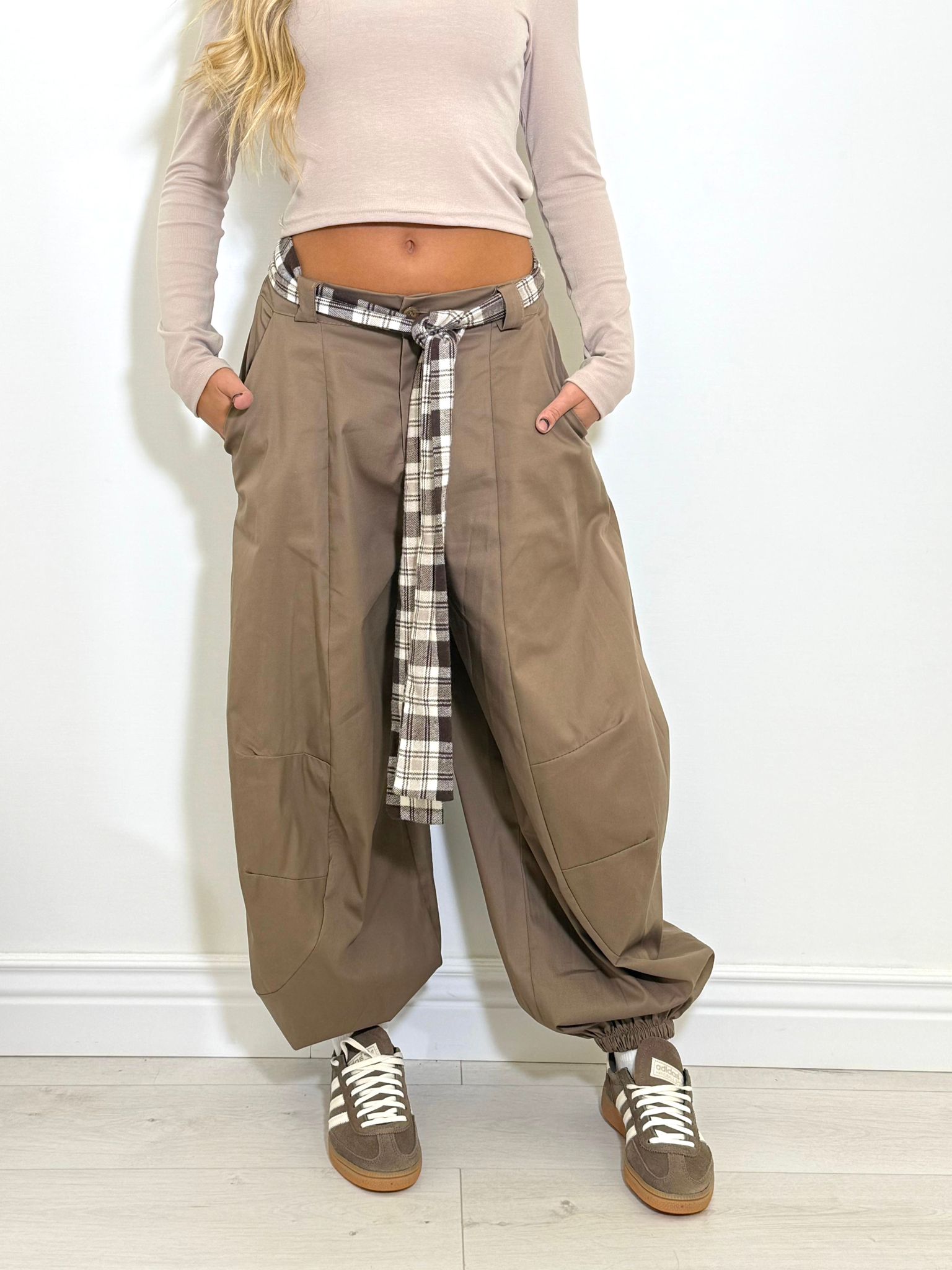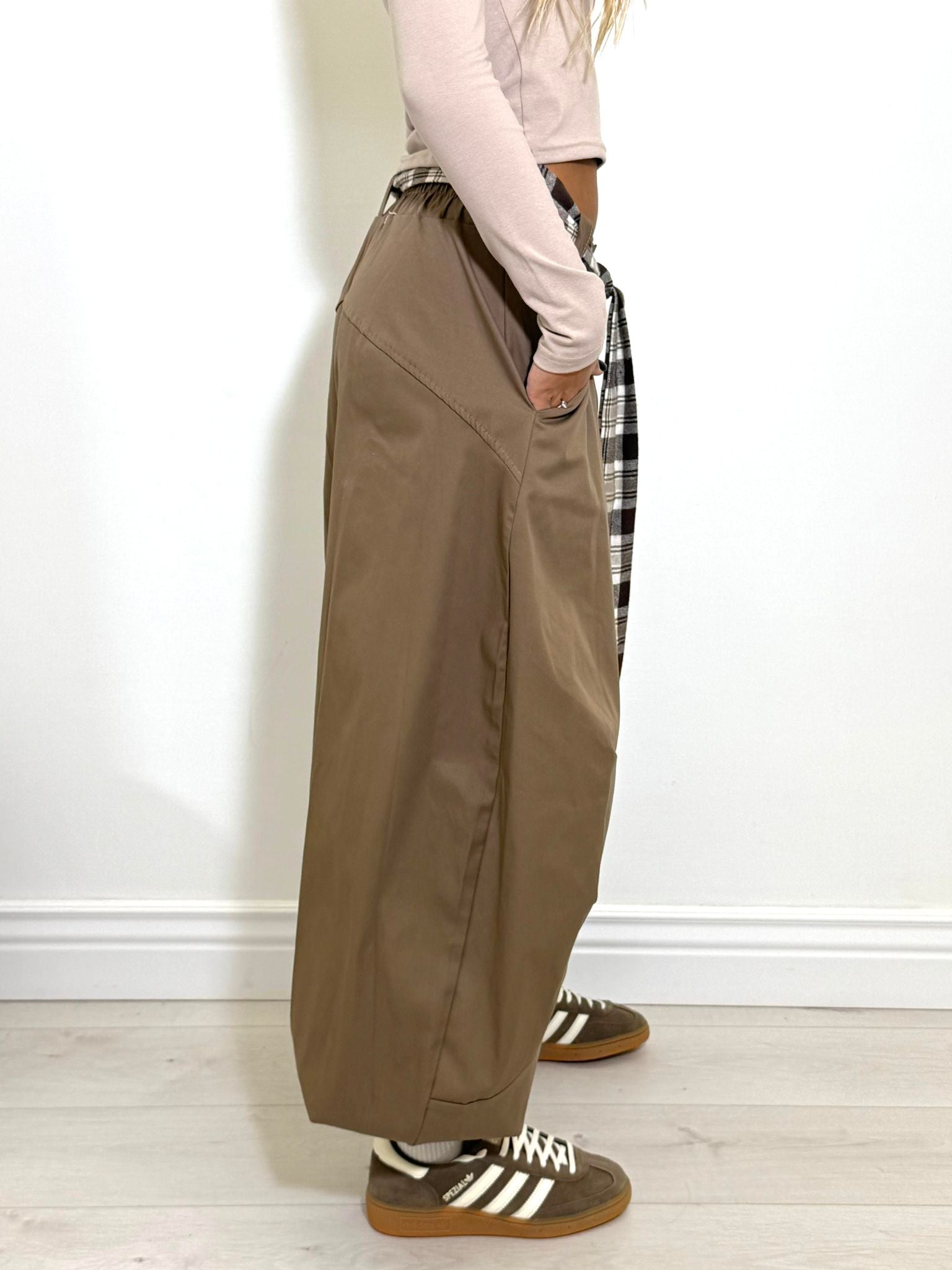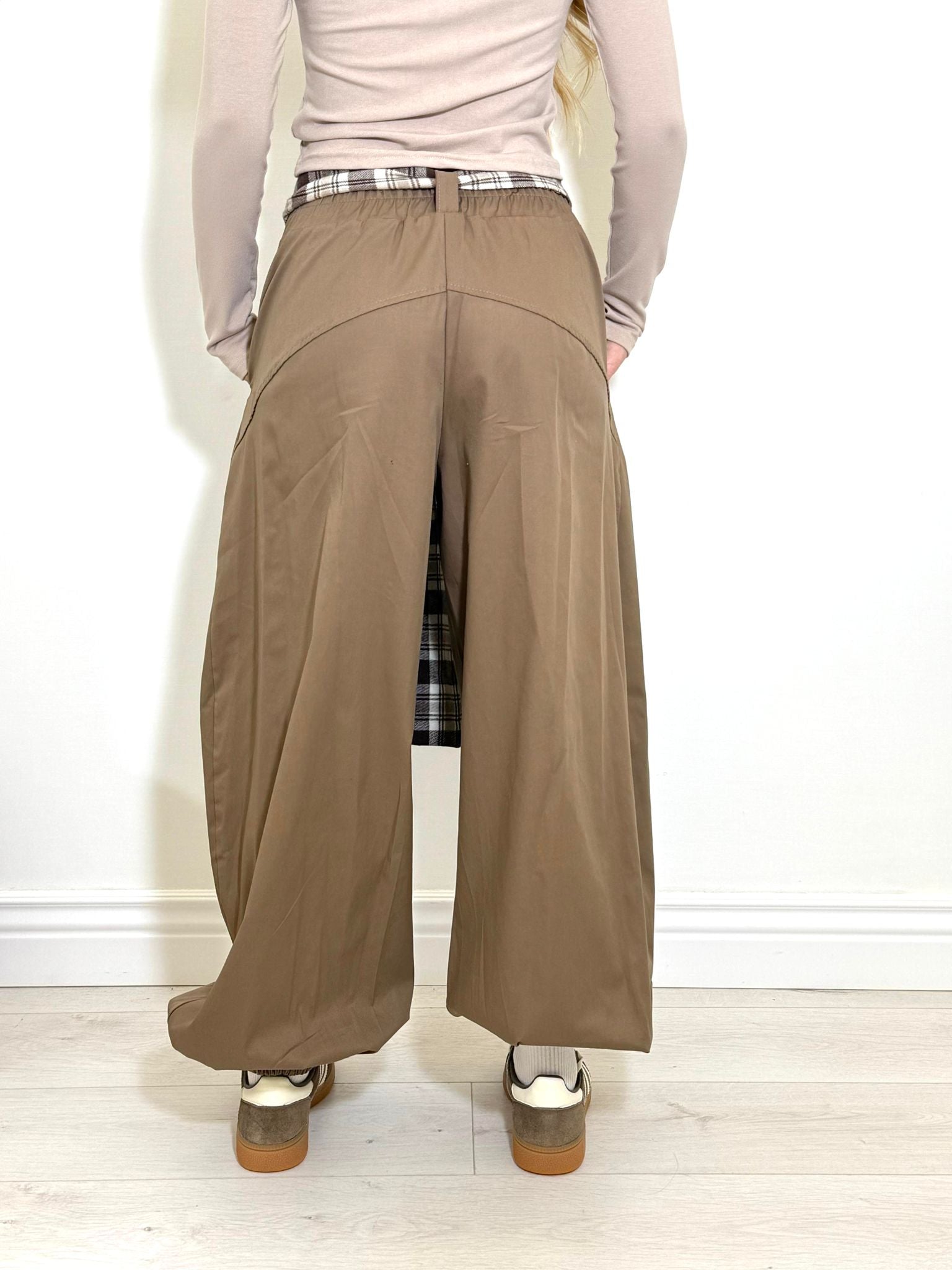 Pantalone in cotone con cintura in tessuto felpato trama a quadri.