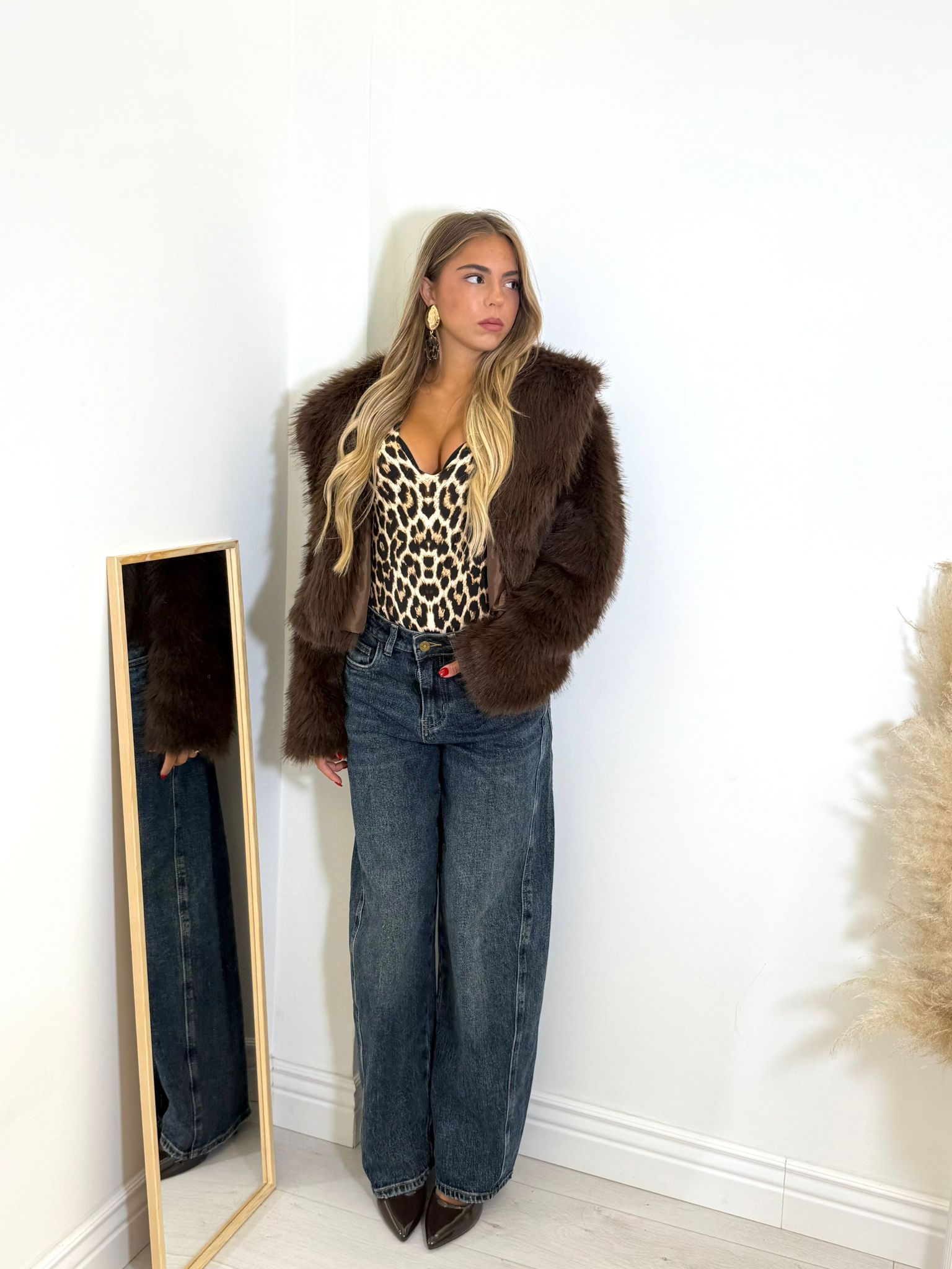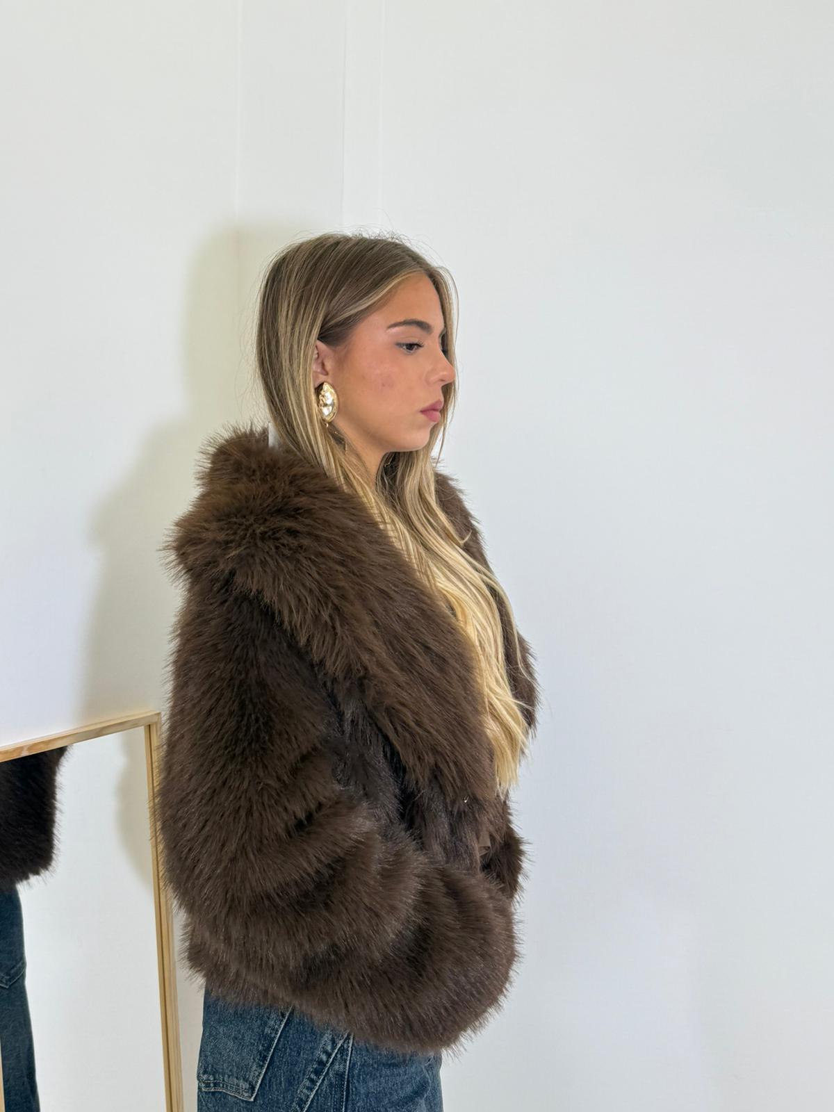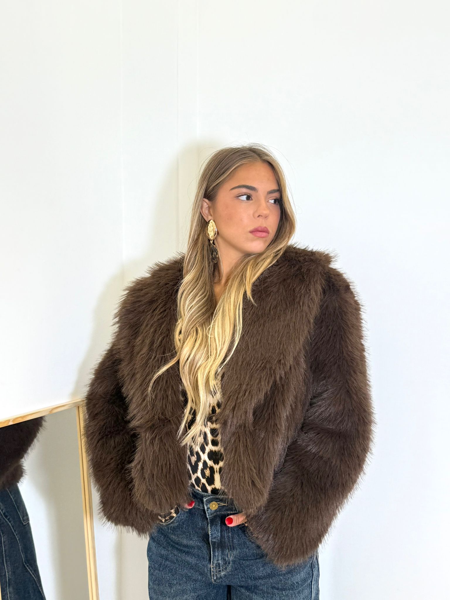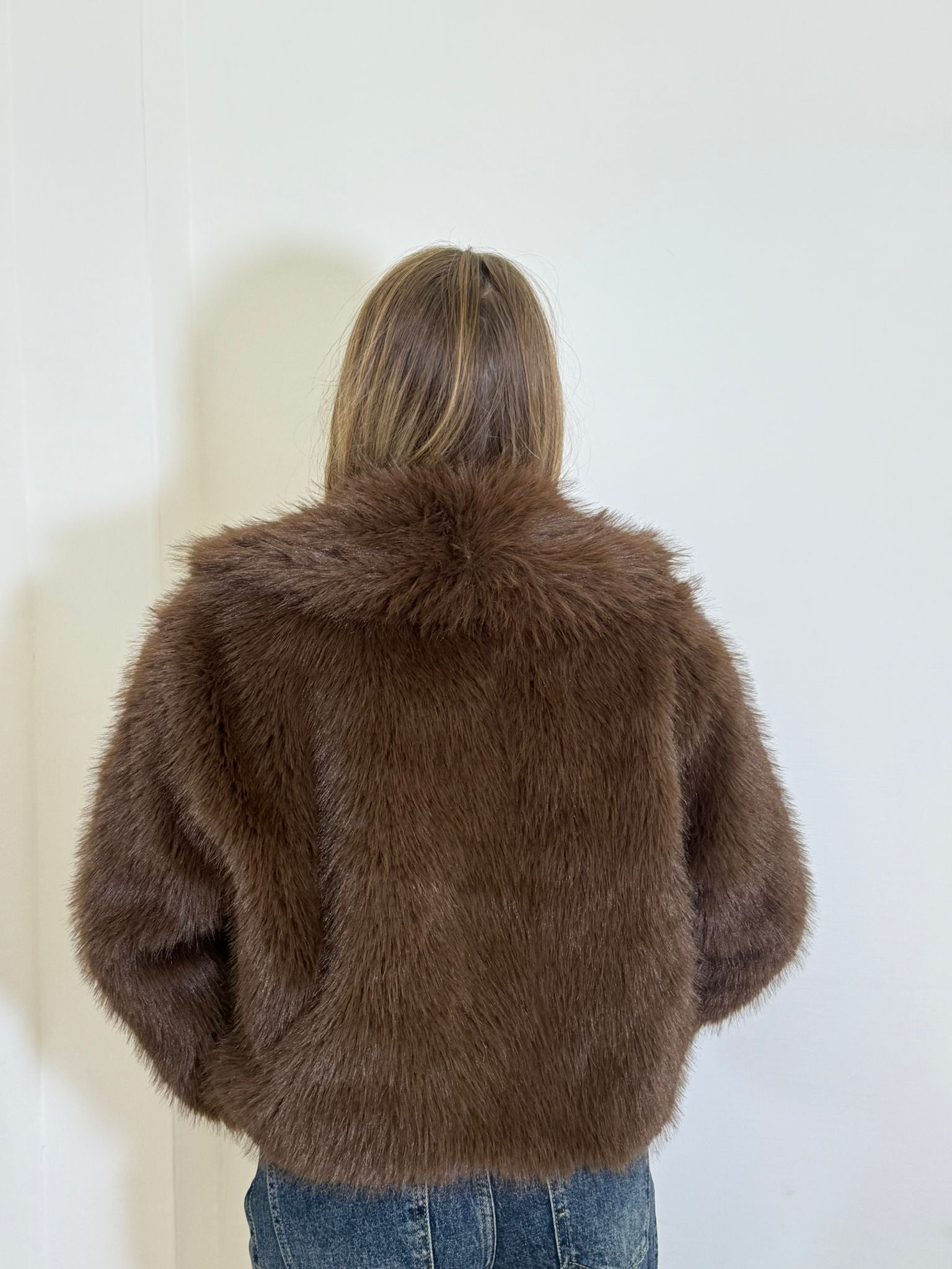 Eco- pelliccia crop a pelo lungo sintetico a maniche lunghe con rever ampio, effetto soffice e vaporoso, "pelliccia liscia"