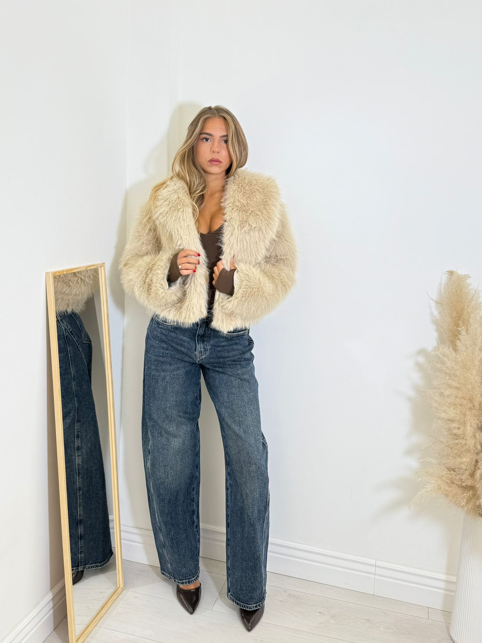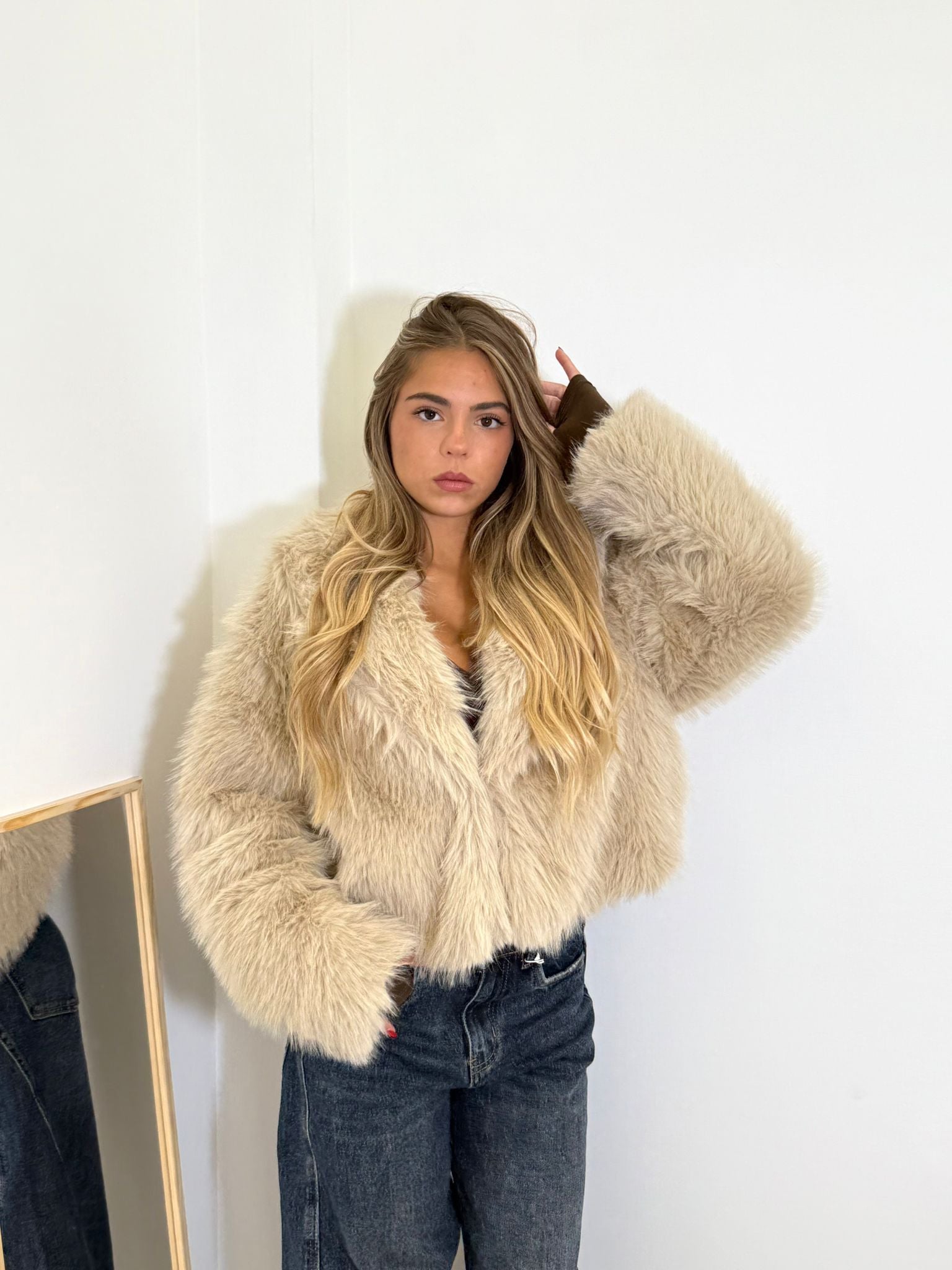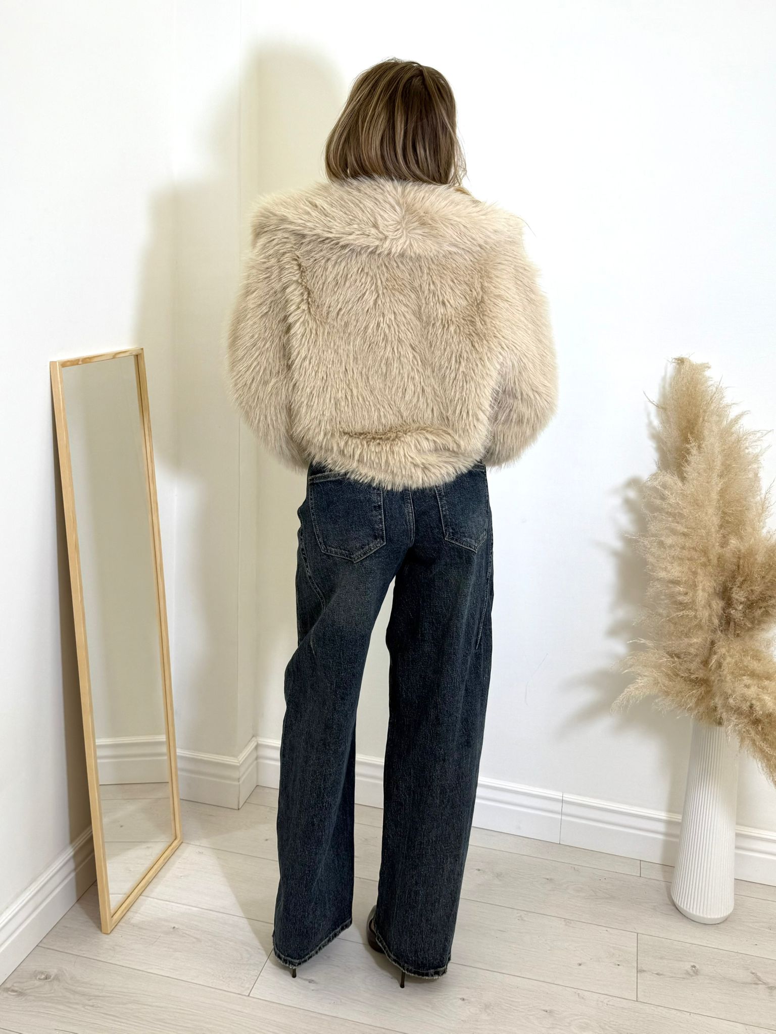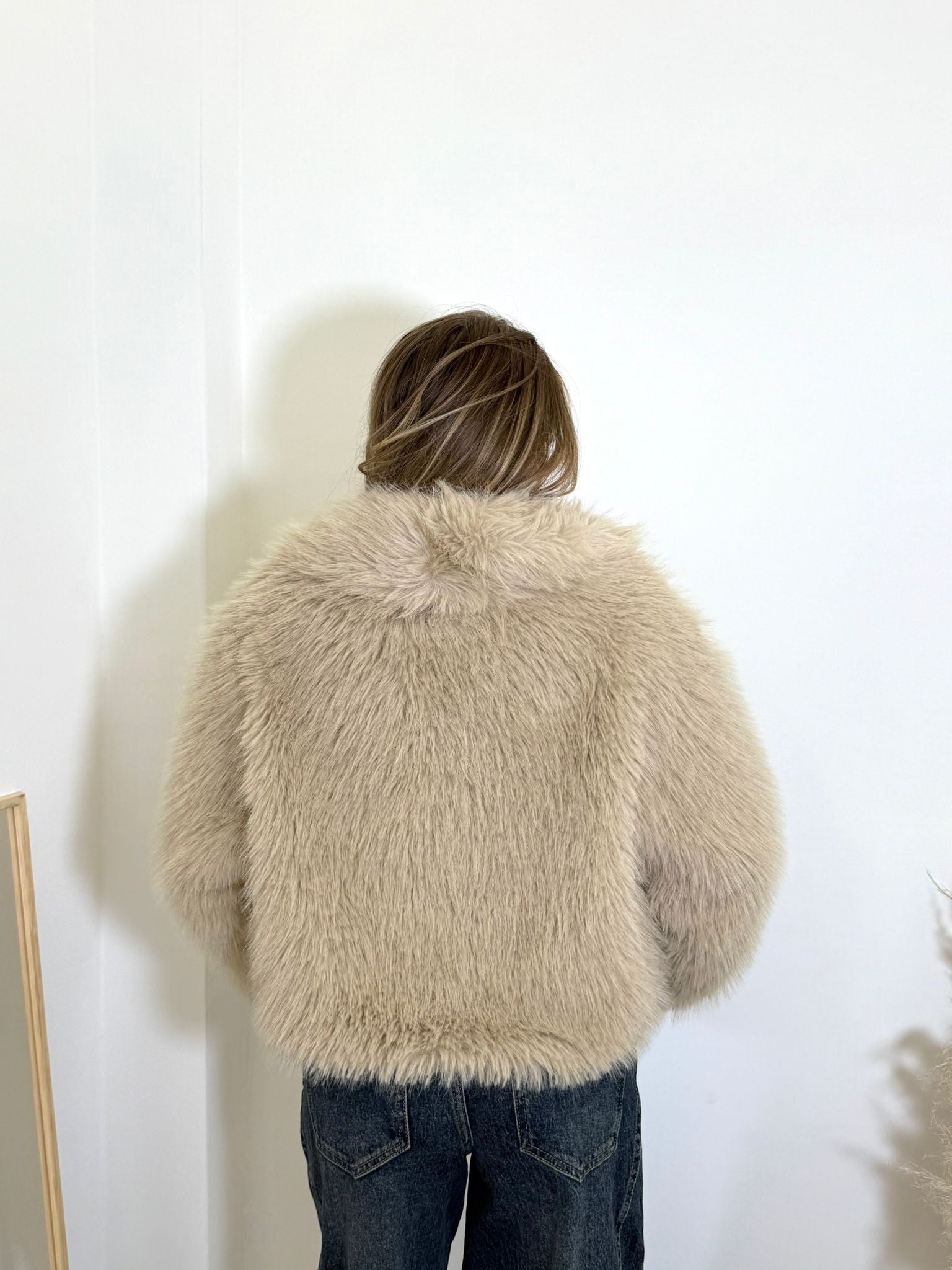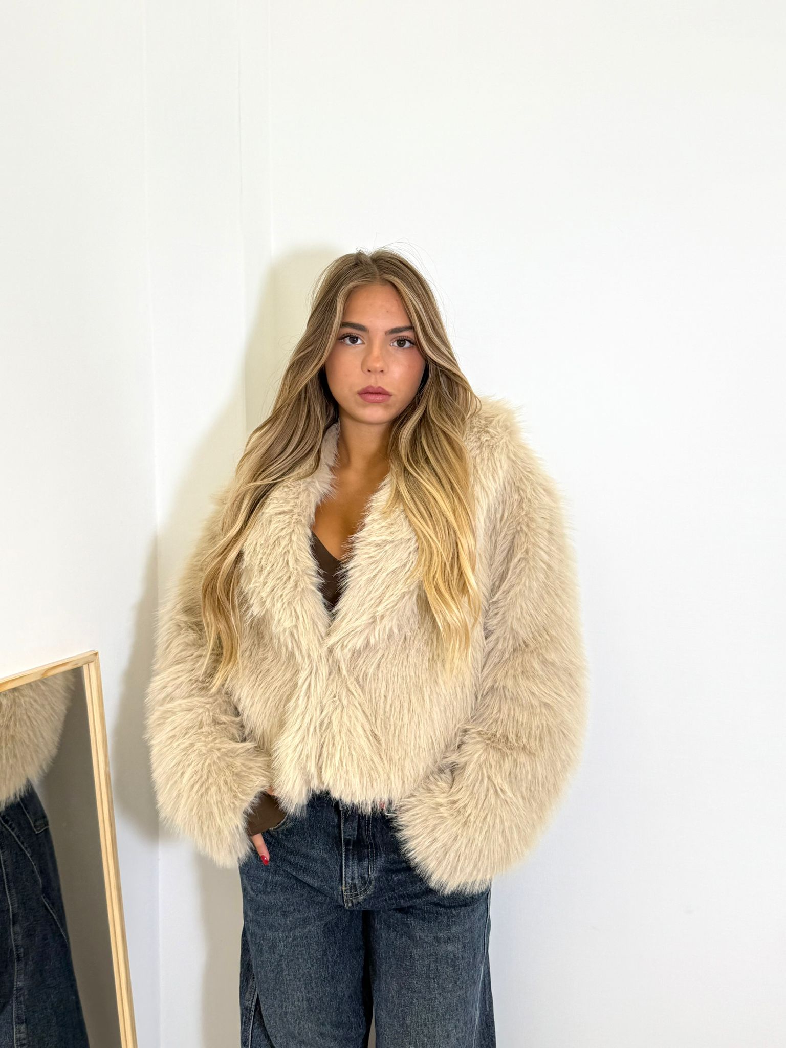 Eco- pelliccia crop a pelo lungo sintetico a maniche lunghe con rever ampio, effetto soffice e vaporoso, "pelliccia liscia"