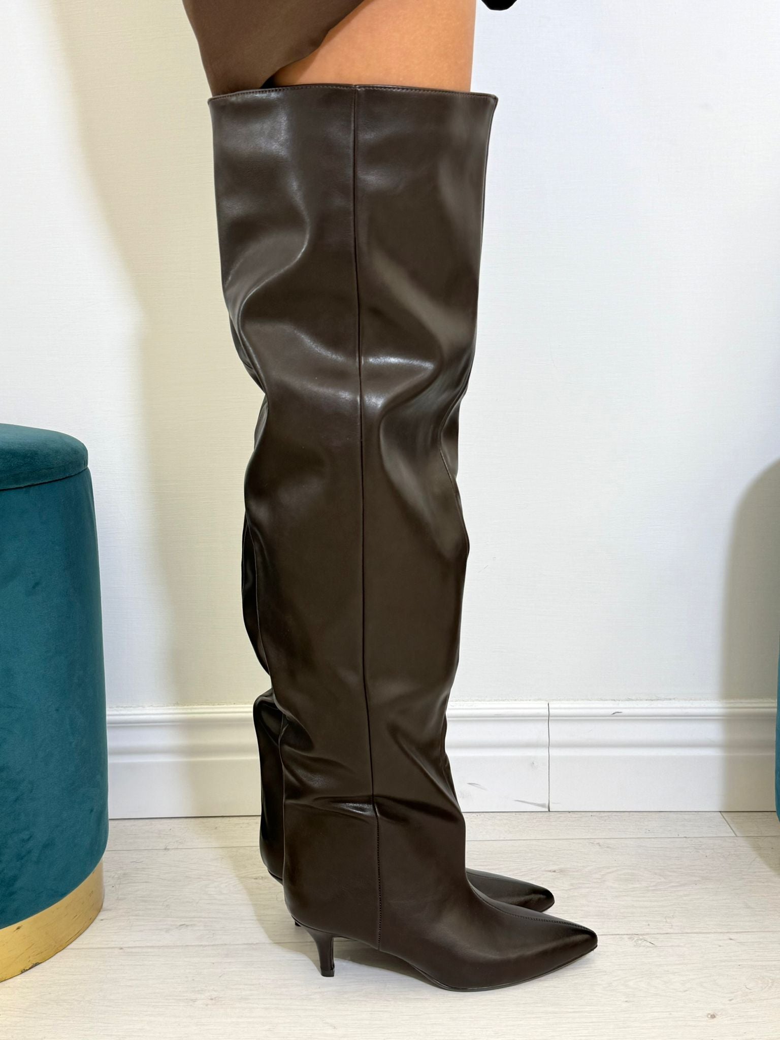 Stivale alto in eco pelle satinata con arricciatura e tacco 5cm.