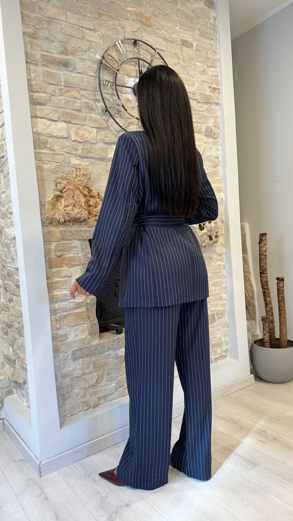 Tailleur in cotone gessato composto da blazer modello over, tasche finte, spalline rinforzate e pantalone taglio maschile e elastico sul retro.