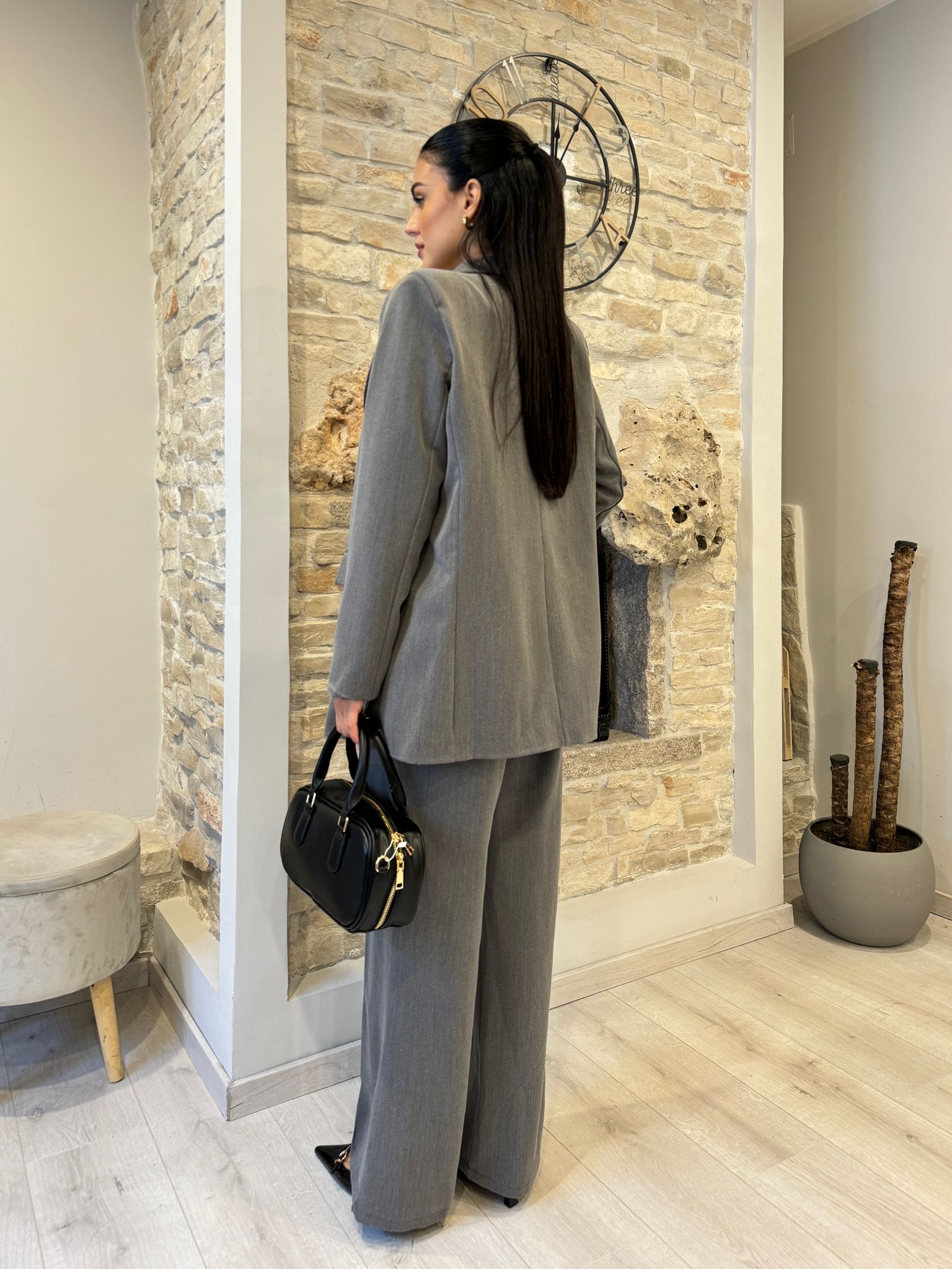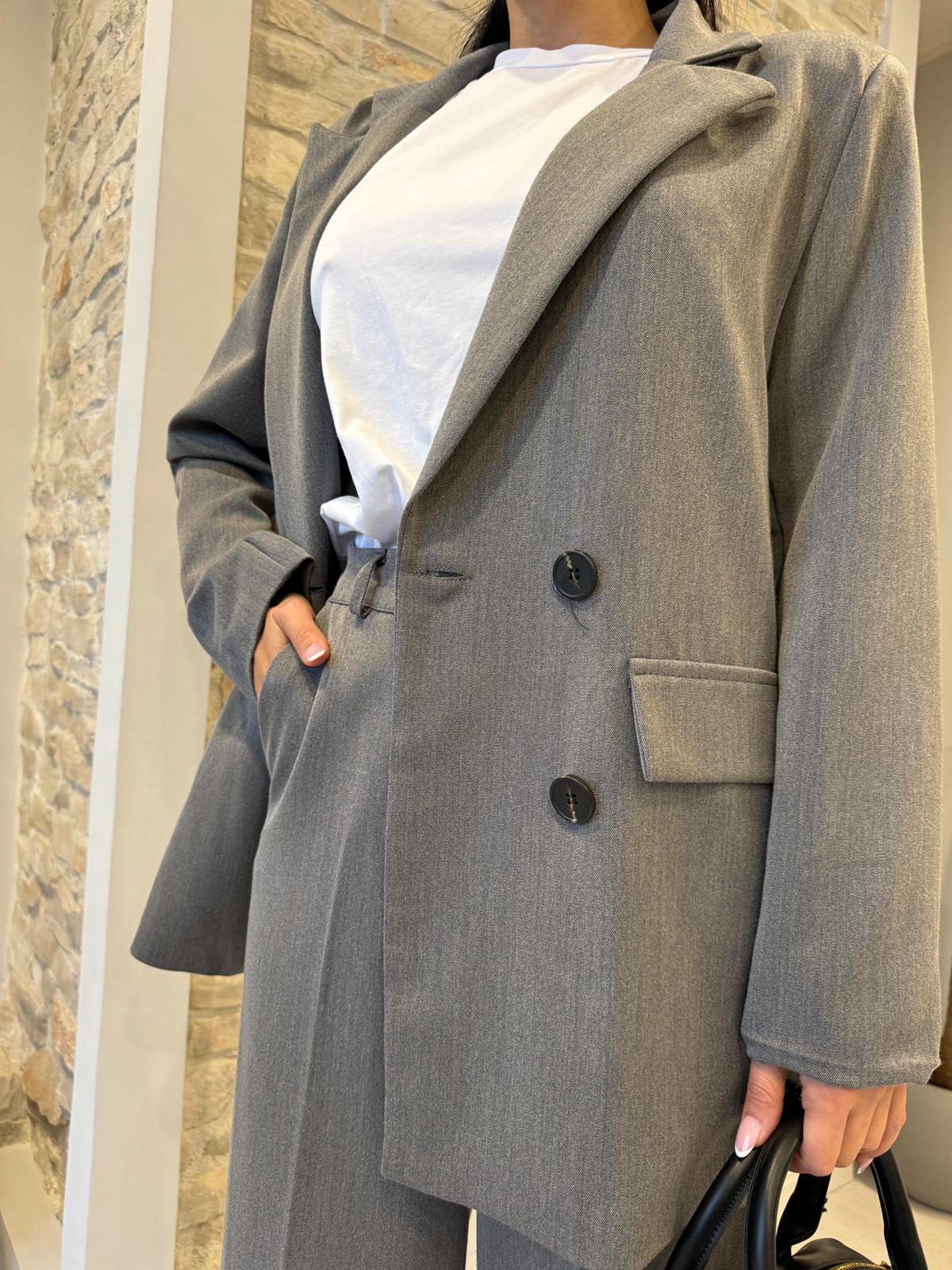 Tailleur in cotone composto da blazer doppio petto modello over, tasche finte, spalline rinforzate e pantalone a palazzo e elastico sul retro.