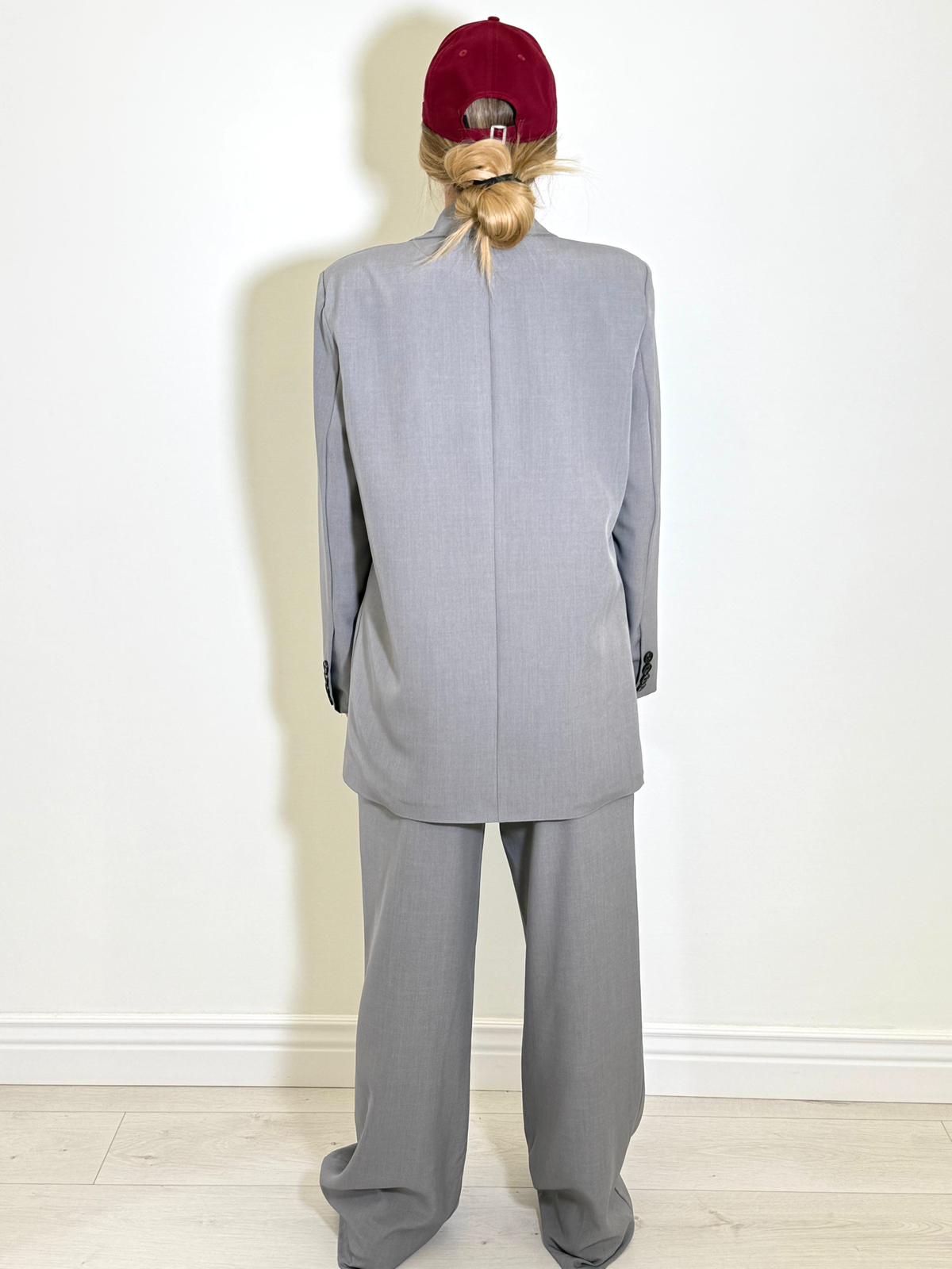 Tailleur in cotone composto da blazer over doppi bottoni e tasche finte, pantalone a palazzo over con bottone in vita.