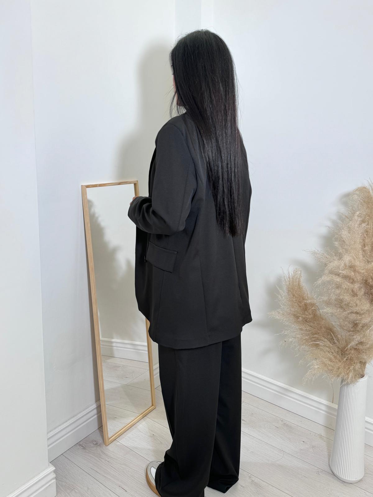 Tailleur in cotone composto da blazer over doppi bottoni e tasche finte, pantalone a palazzo over con bottone in vita.