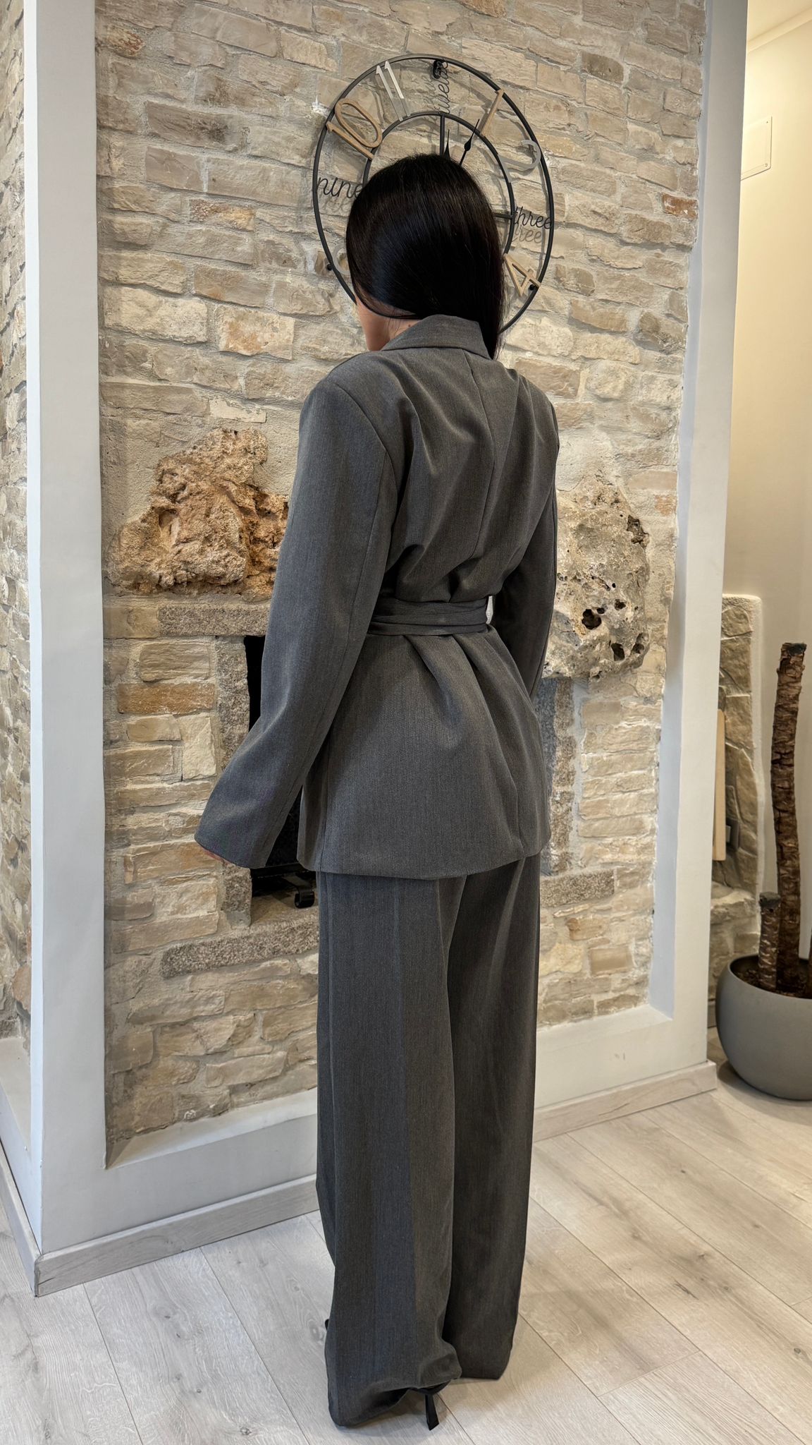 Tailleur in cotone composto da blazer modello over, tasche finte, spalline rinforzate con cintura e pantalone a palazzo e elastico sul retro.