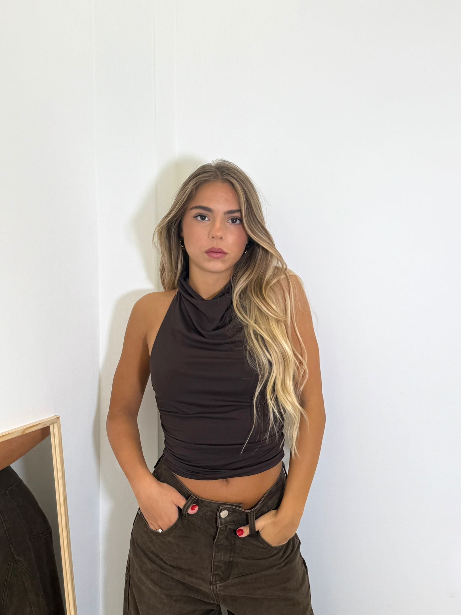 Top crop in jersey con attaccatura dietro al collo e schiena scollata, con dettaglio in oro anteriore.