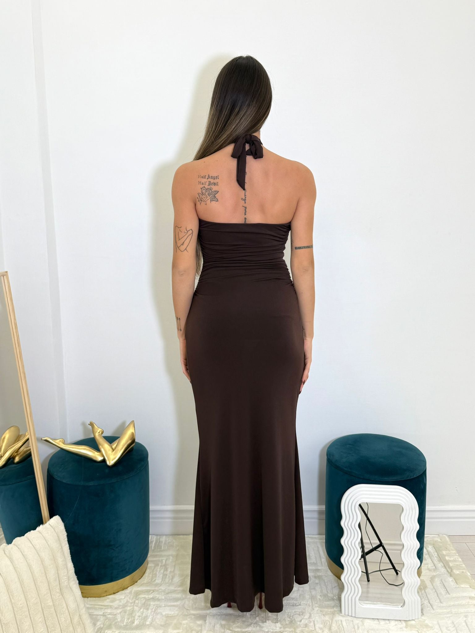 Abito aderentre lungo in jersey elasticizzato effetto seta, scollo profondo con dettaglio cut-out centrale sul decolletè e spalline che si incrociano sul collo creando un effetto halter incrociato.