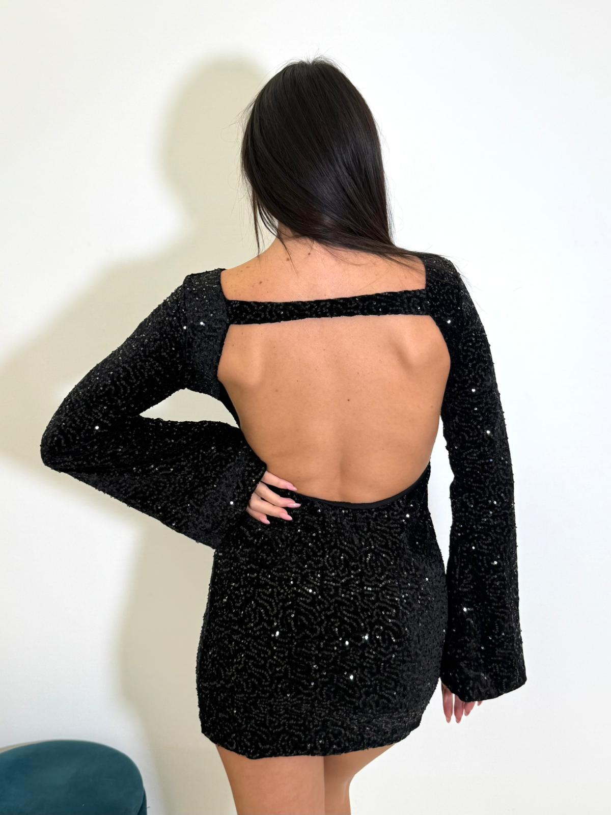 Abito mini in paillettes con maniche over e schiena scoperta.