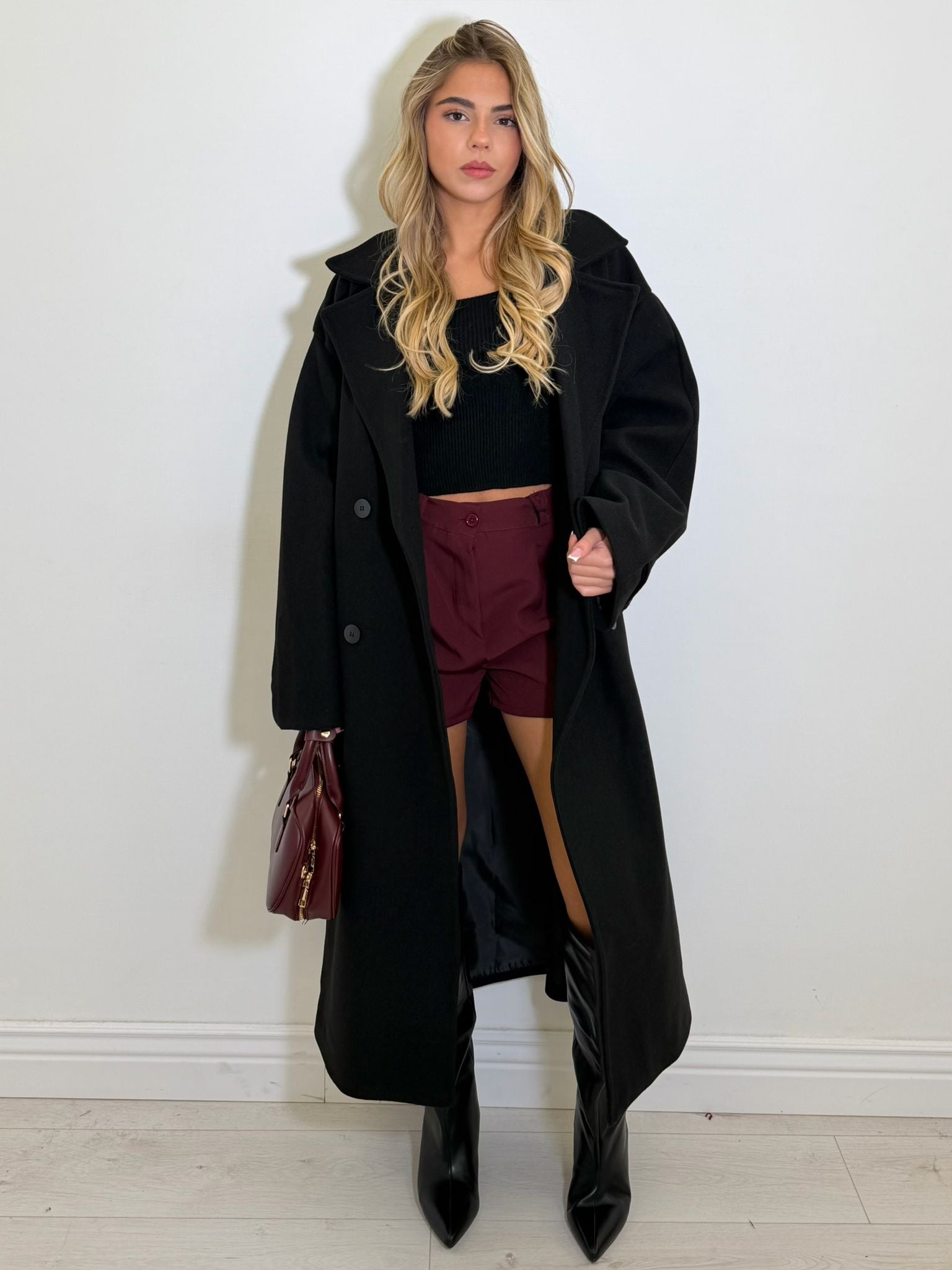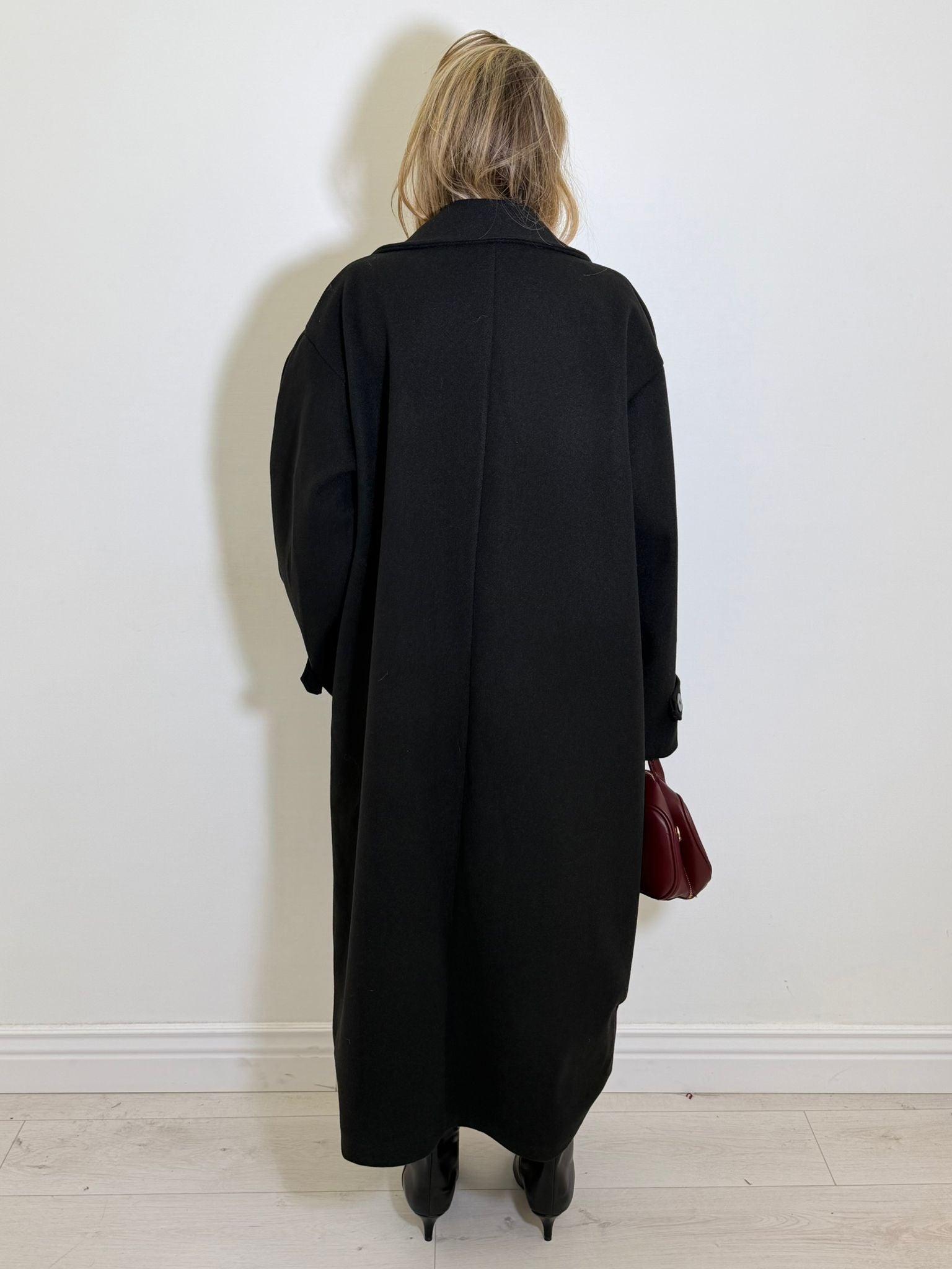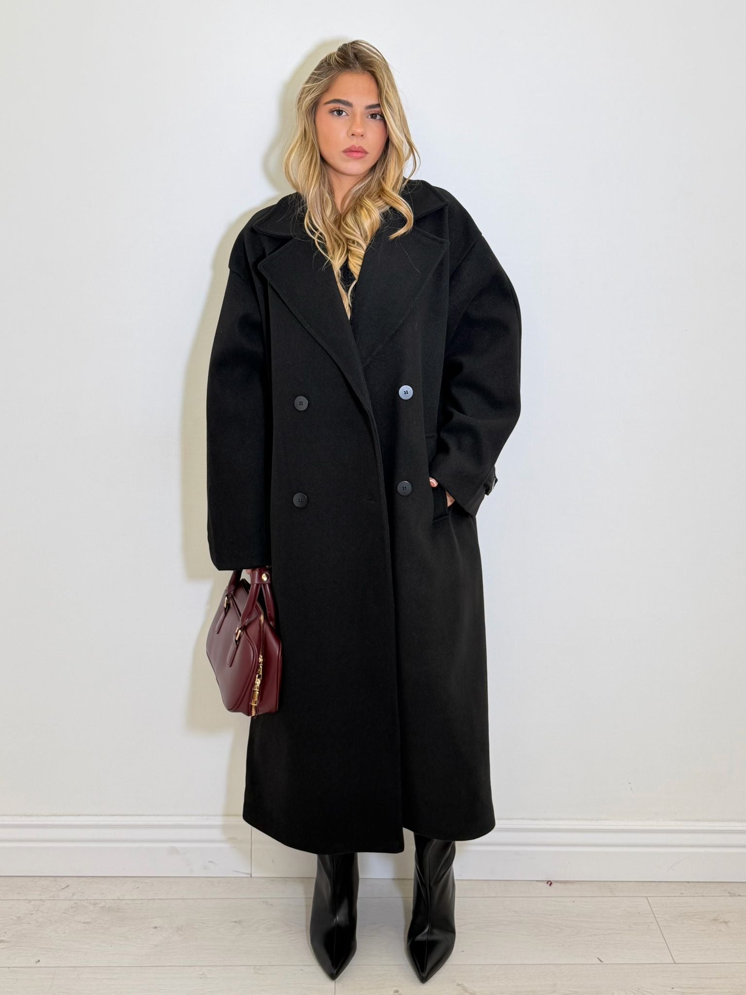 cappotto long in misto lana doppio petto, bottoncini centrali e spalline.