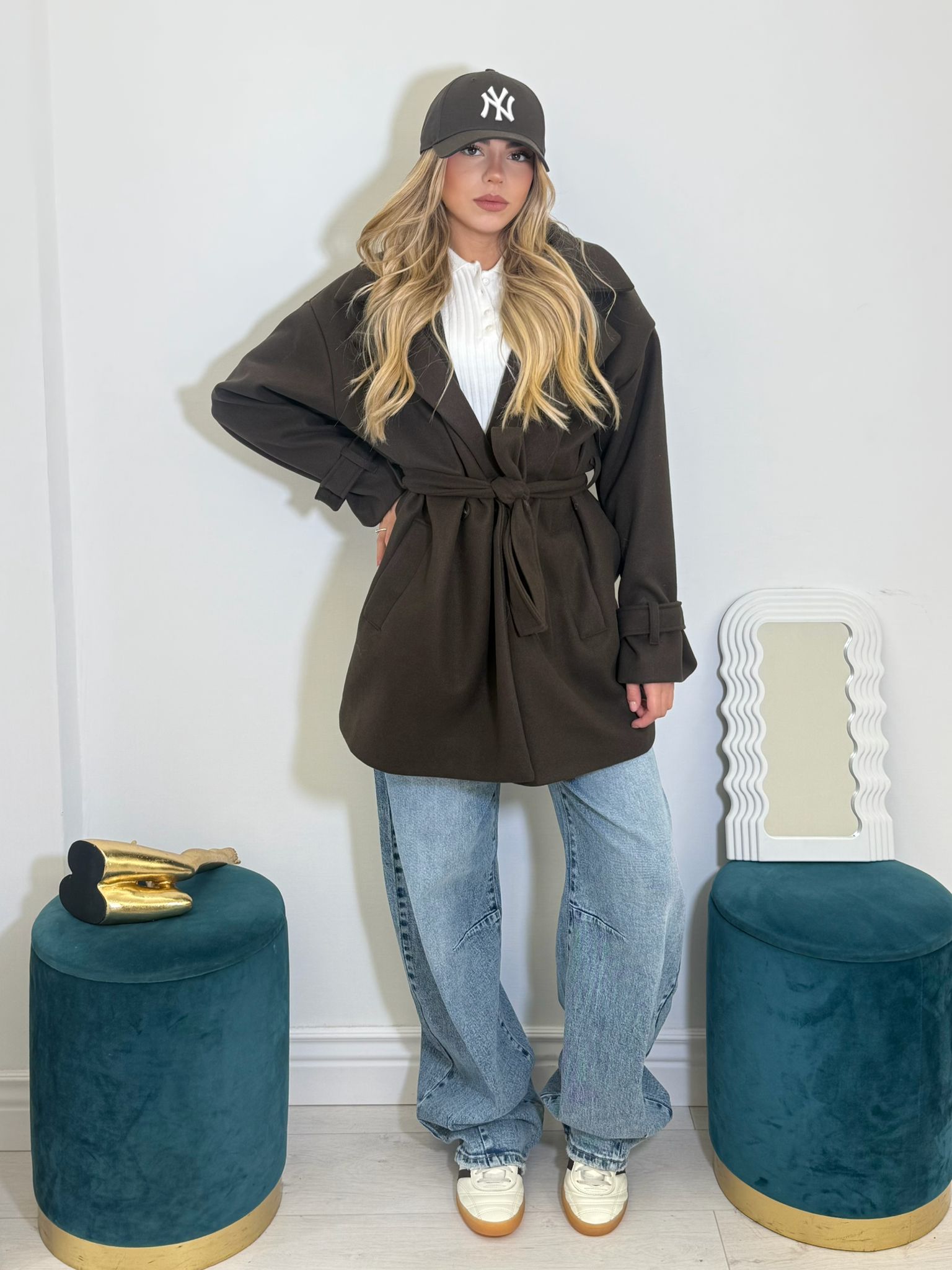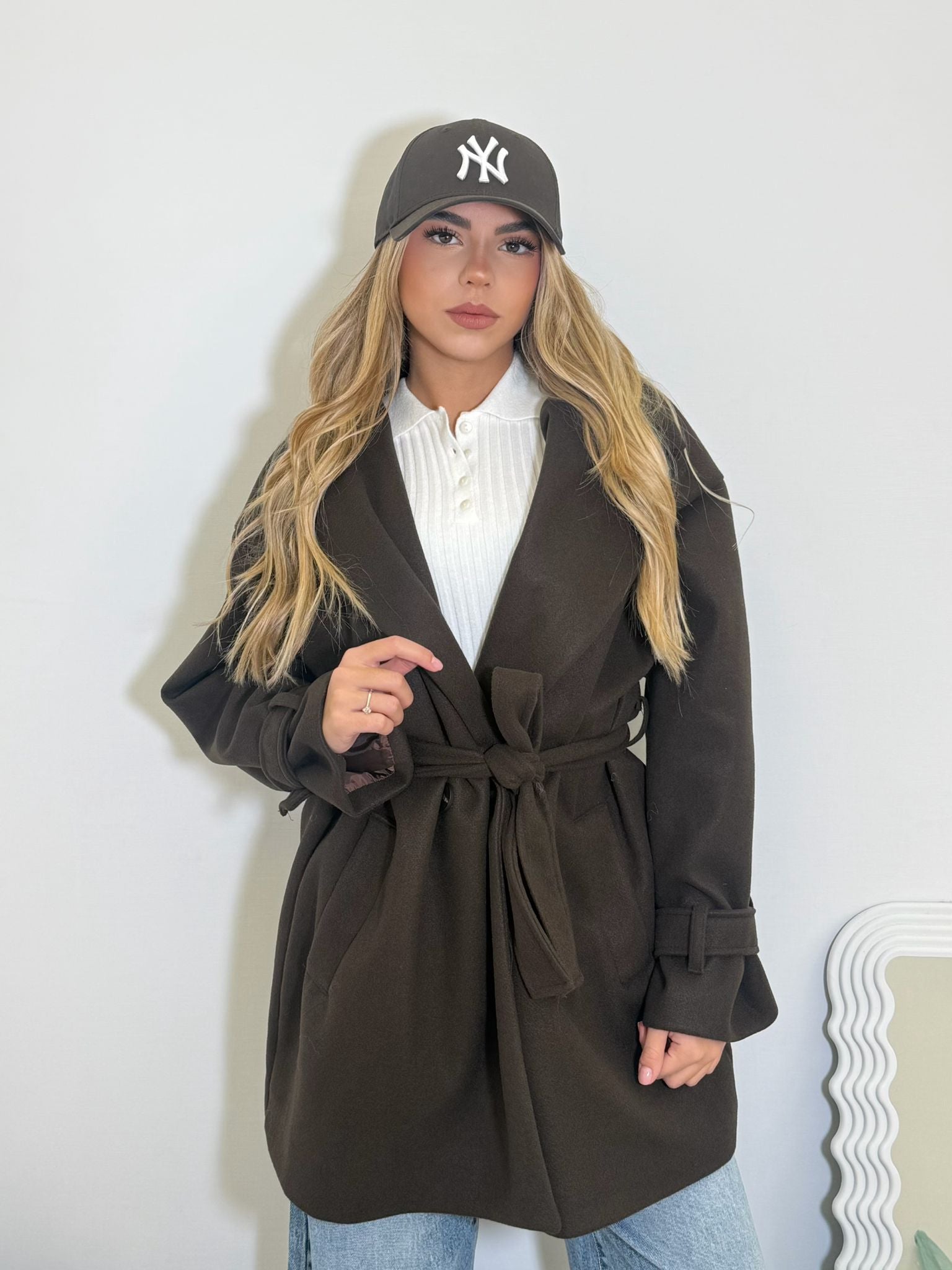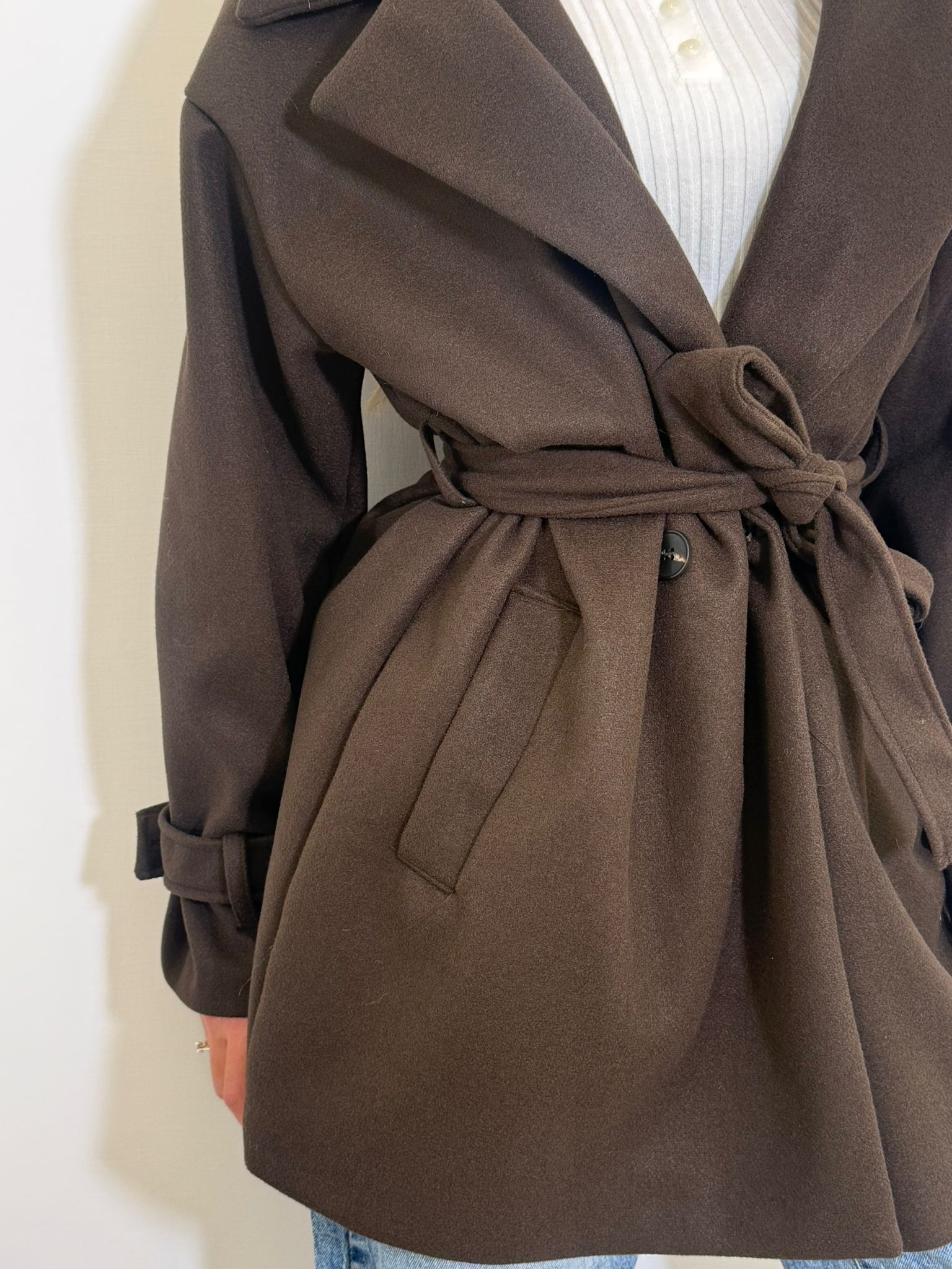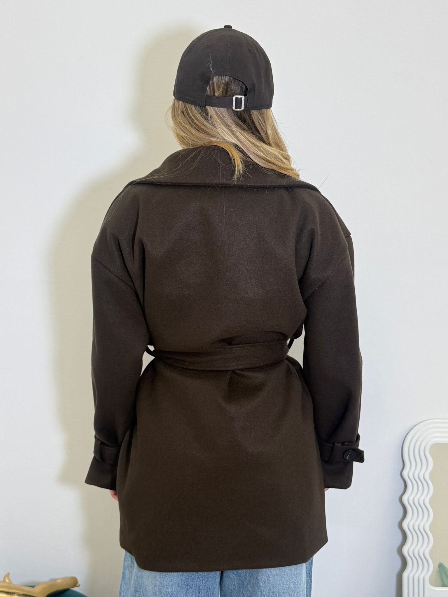 cappotto Blazer in misto lana doppio petto, bottoncini centrali e spalline e cintura regolabile.