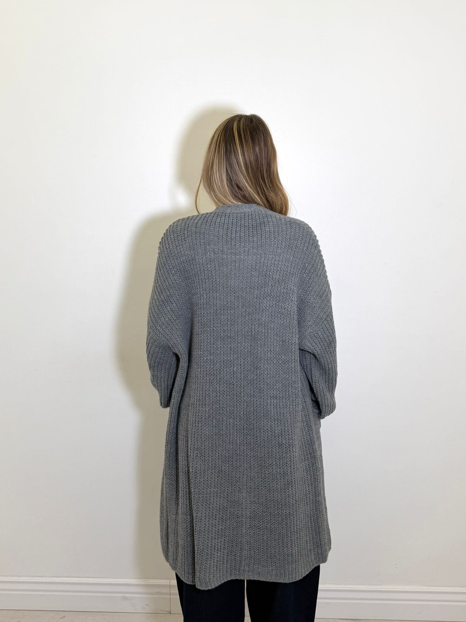 Cardigan semi lungo in simil lana bucherellata con tasche.