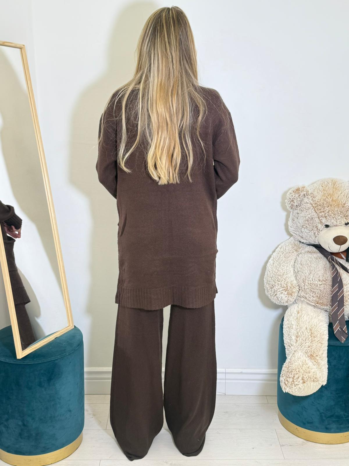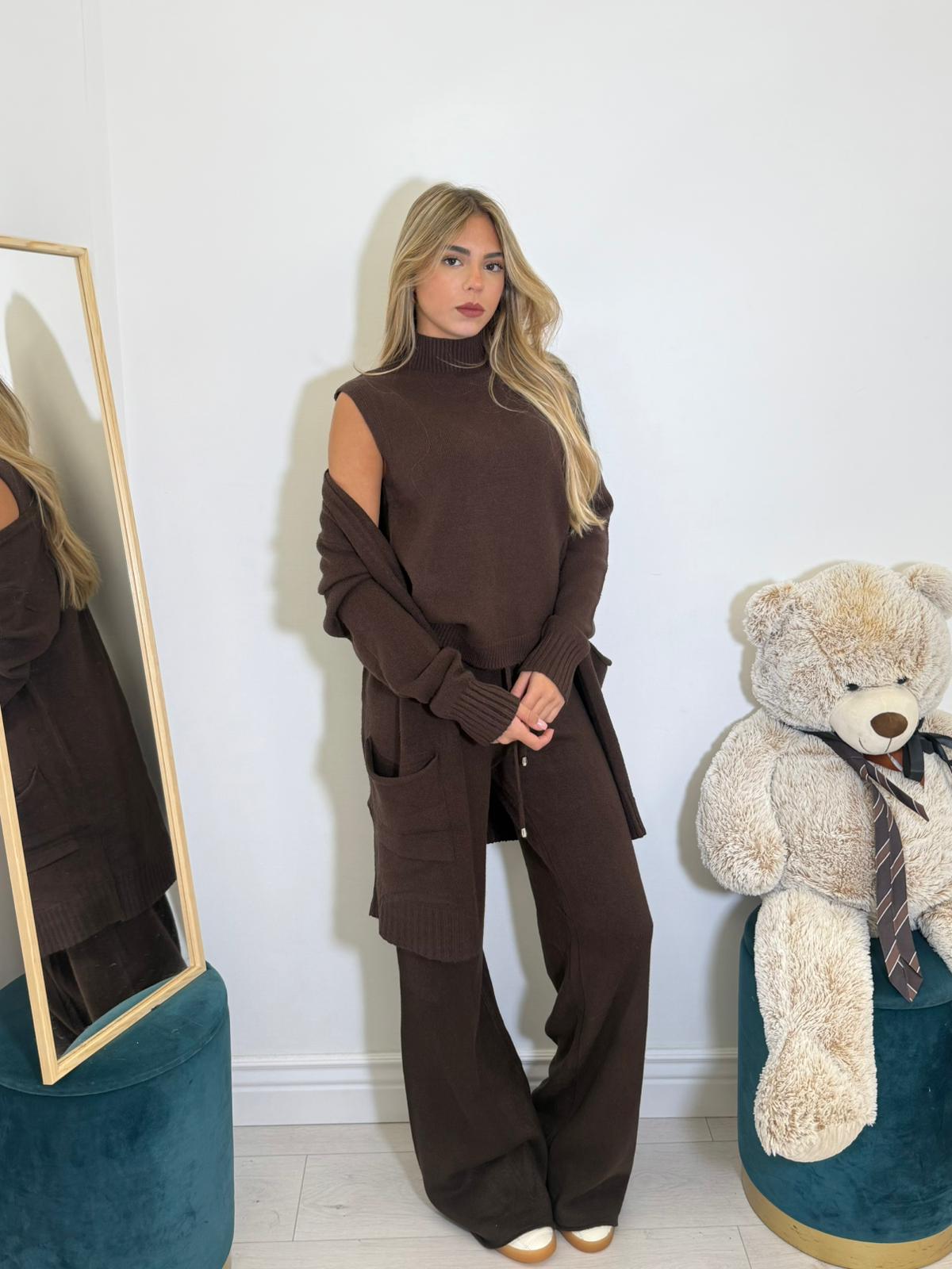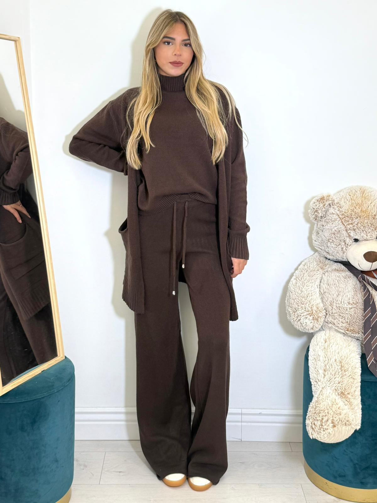 coordinato in simil lana , composto da maglioncino over smanicato con collo alto, cardigan con tasconi e pantalone a gamba dritta con elastico in vita e tasche.