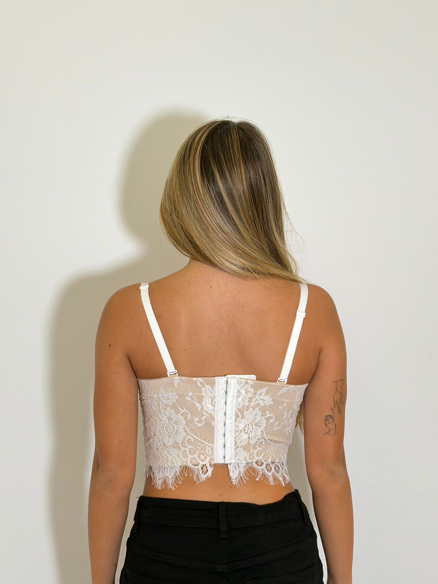 Corpetto bustier con scollo a cuore in pizzo e coppe push up con spalline.