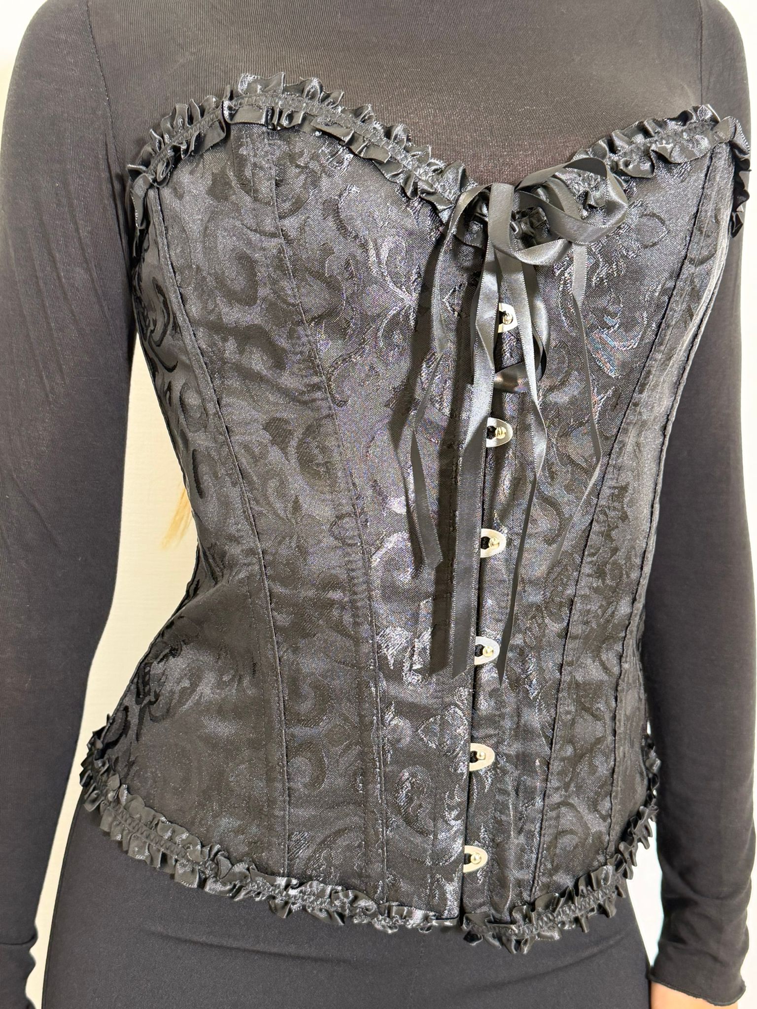 Corpetto bustier con scollo a cuore, con intreccio sul davanti. No coppe. Trama a fiori e rouche sul seno.
