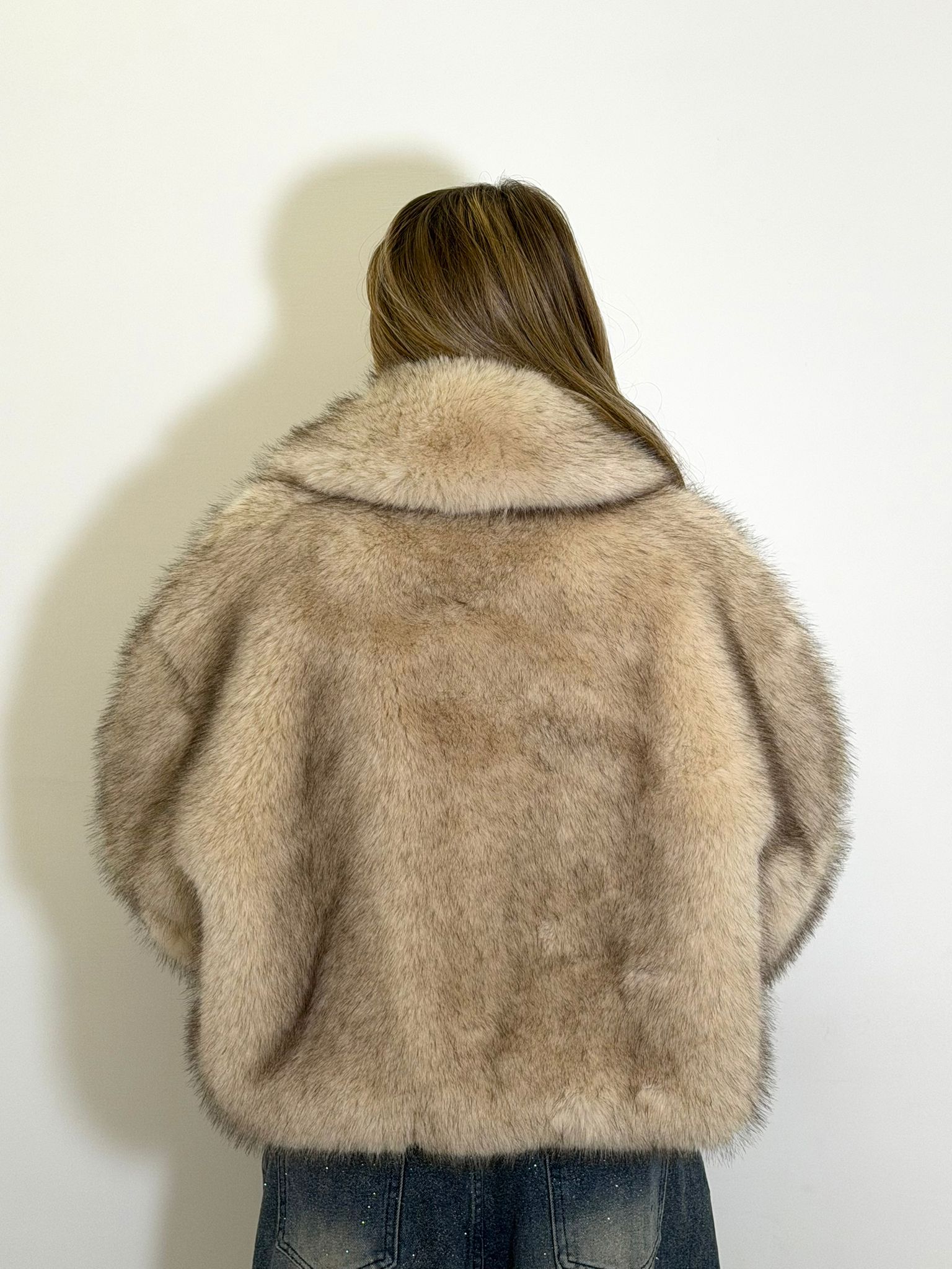 Eco- pelliccia crop a pelo lungo sintetico a maniche lunghe con rever ampio, effetto soffice e vaporoso, "pelliccia liscia" con bottone.