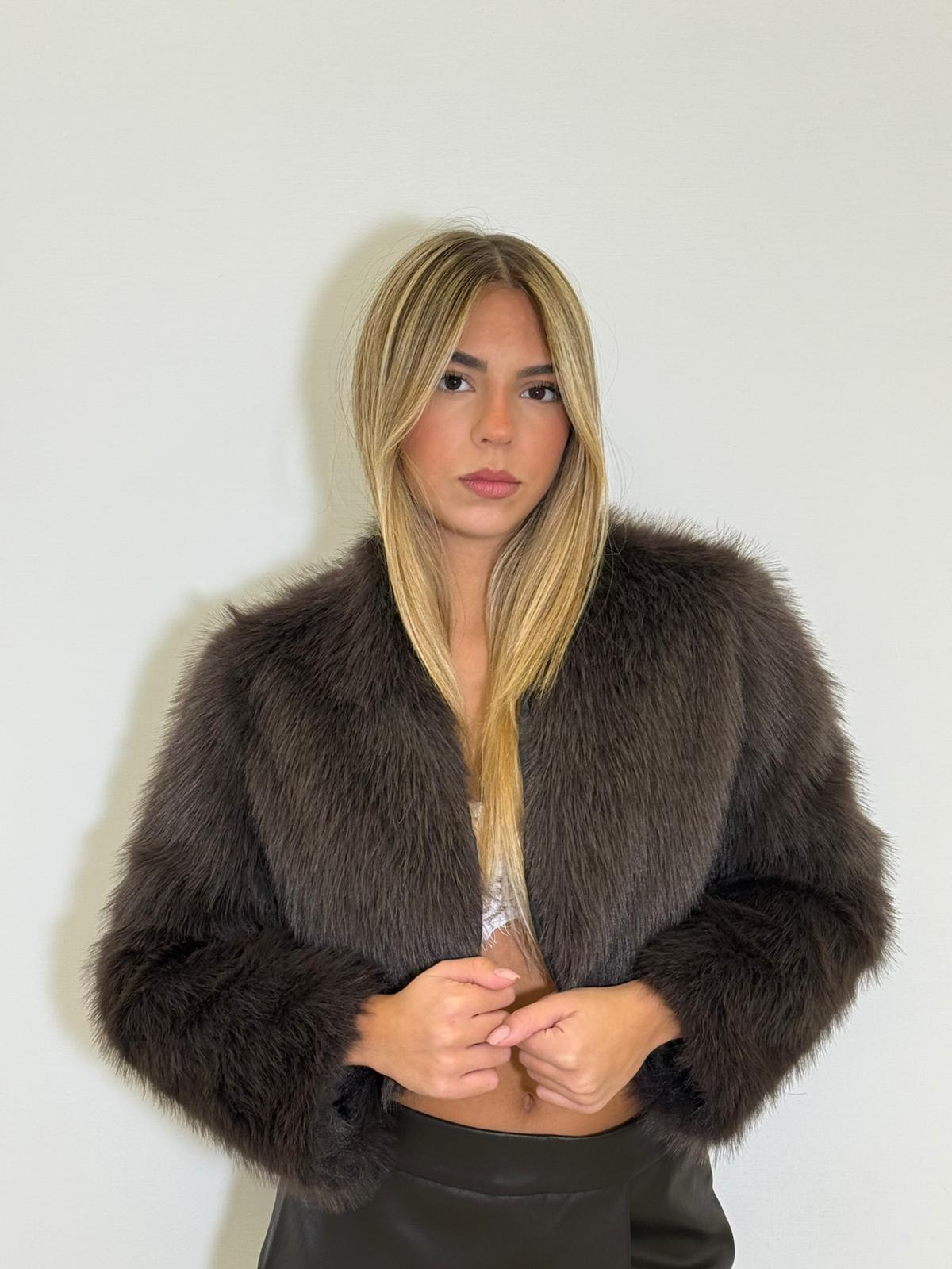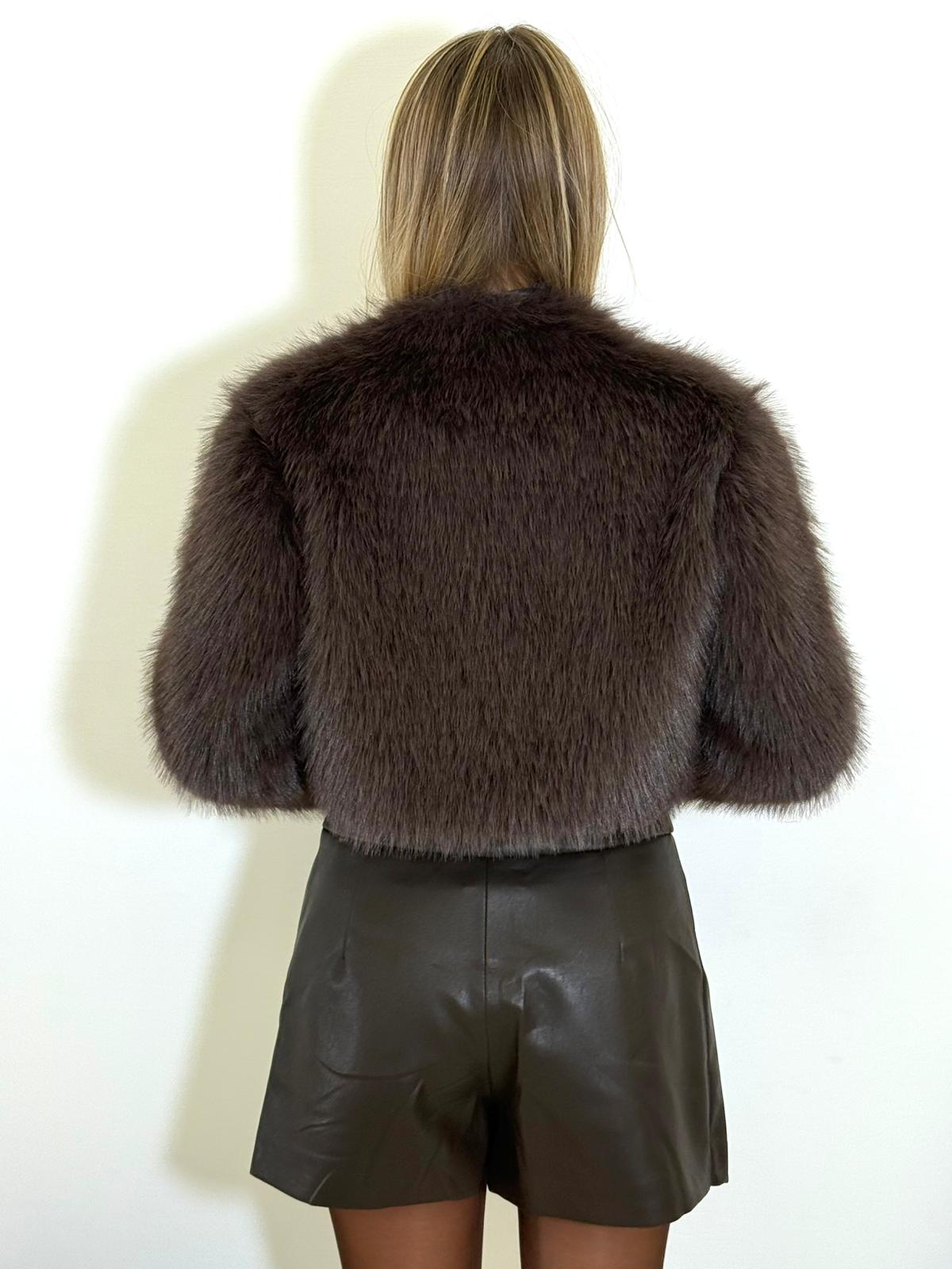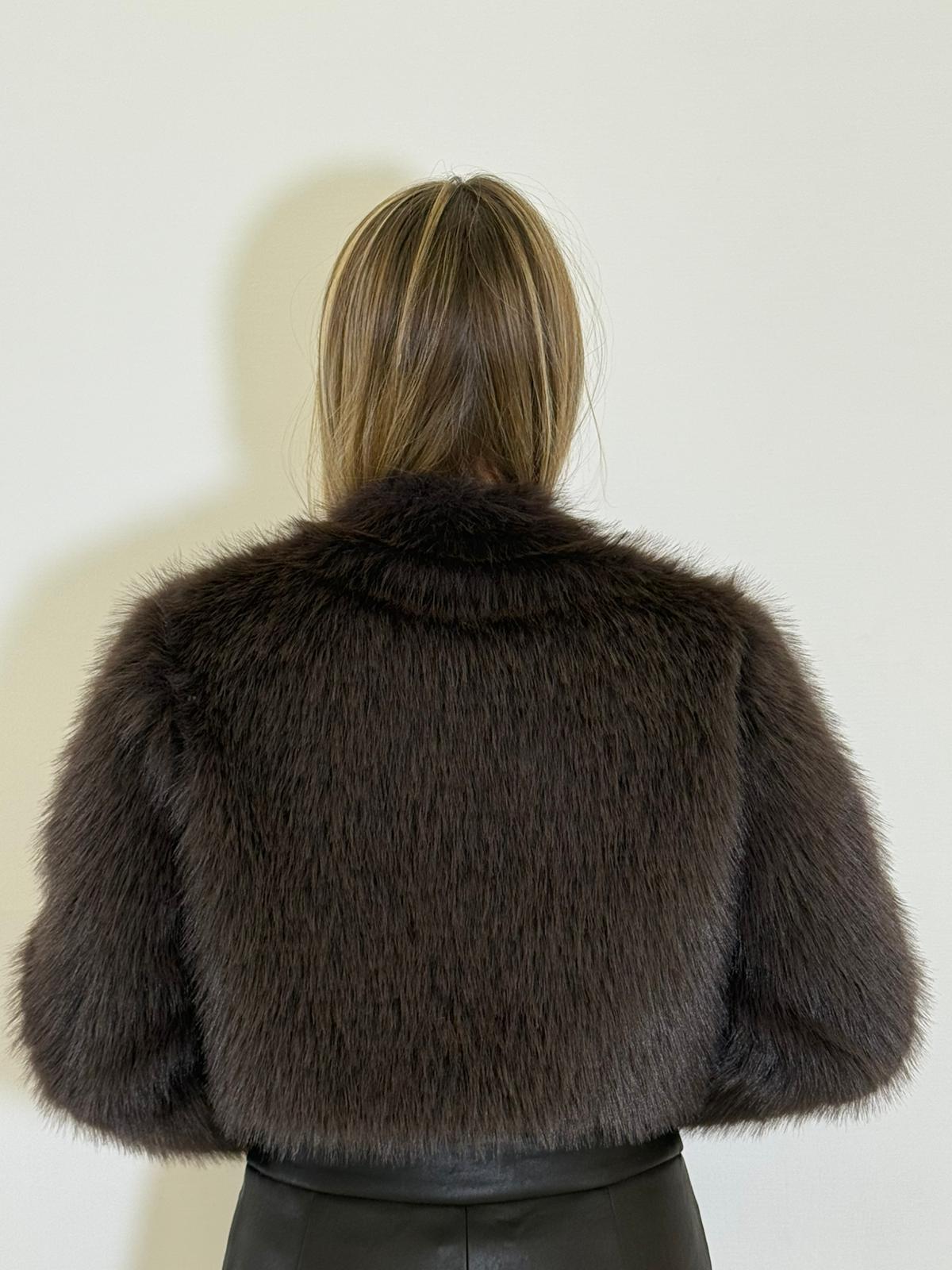 Eco- pelliccia crop a pelo corto sintetico a maniche lunghe.