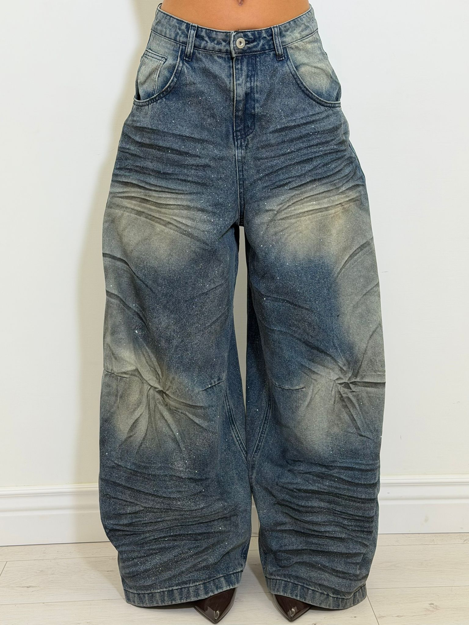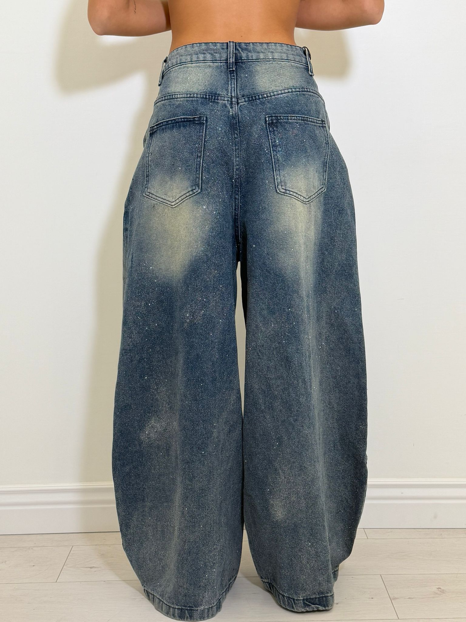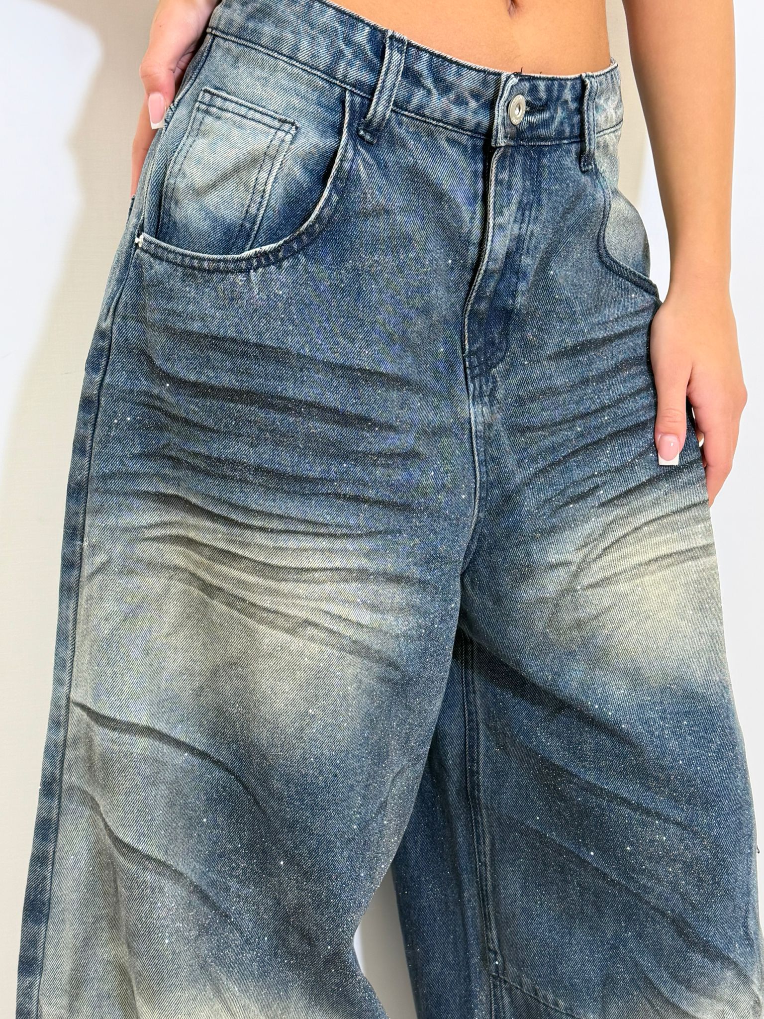 jeans in tela fissa,modello cargo balloon over con brillantini ed effetto tidy.