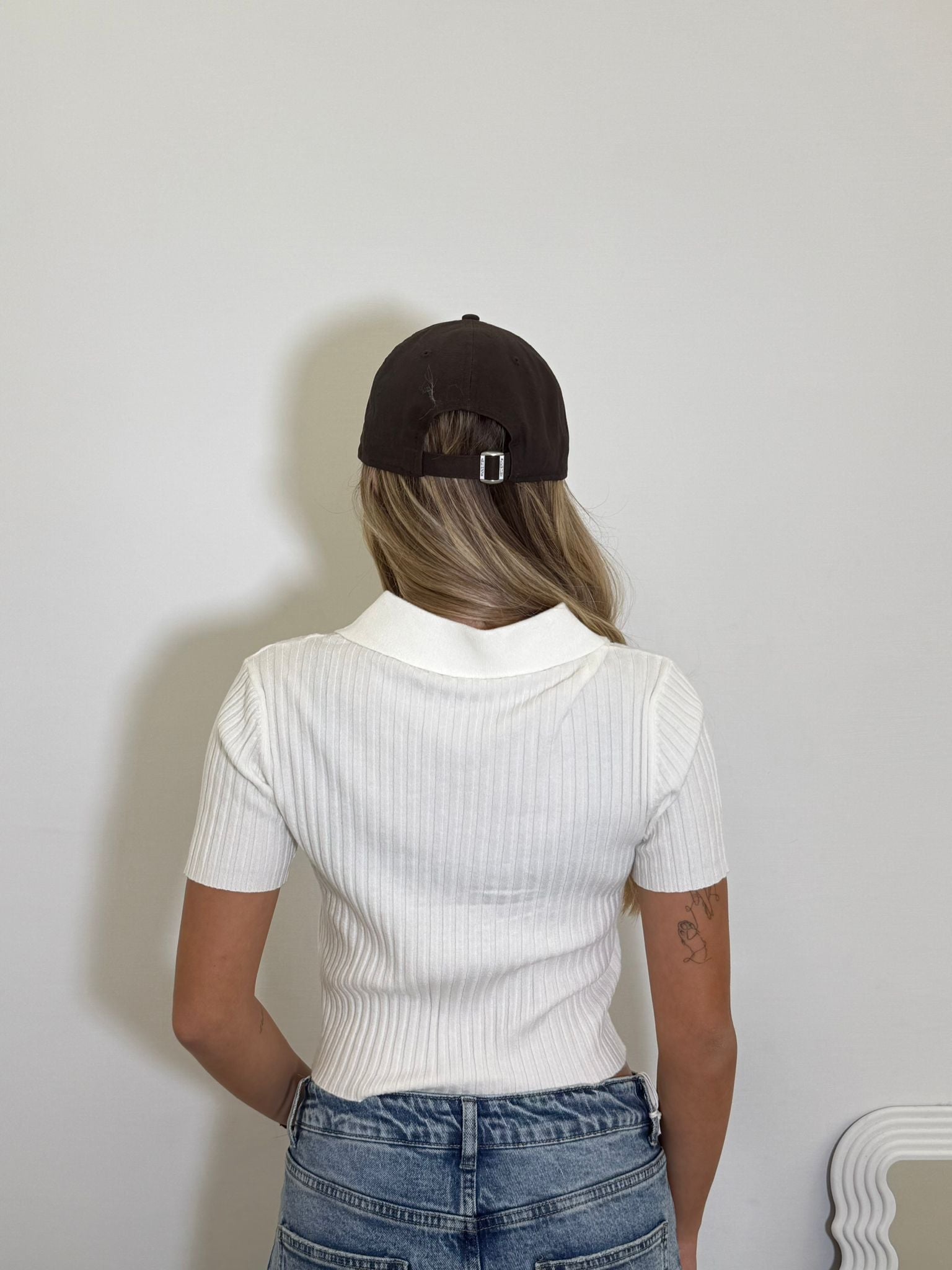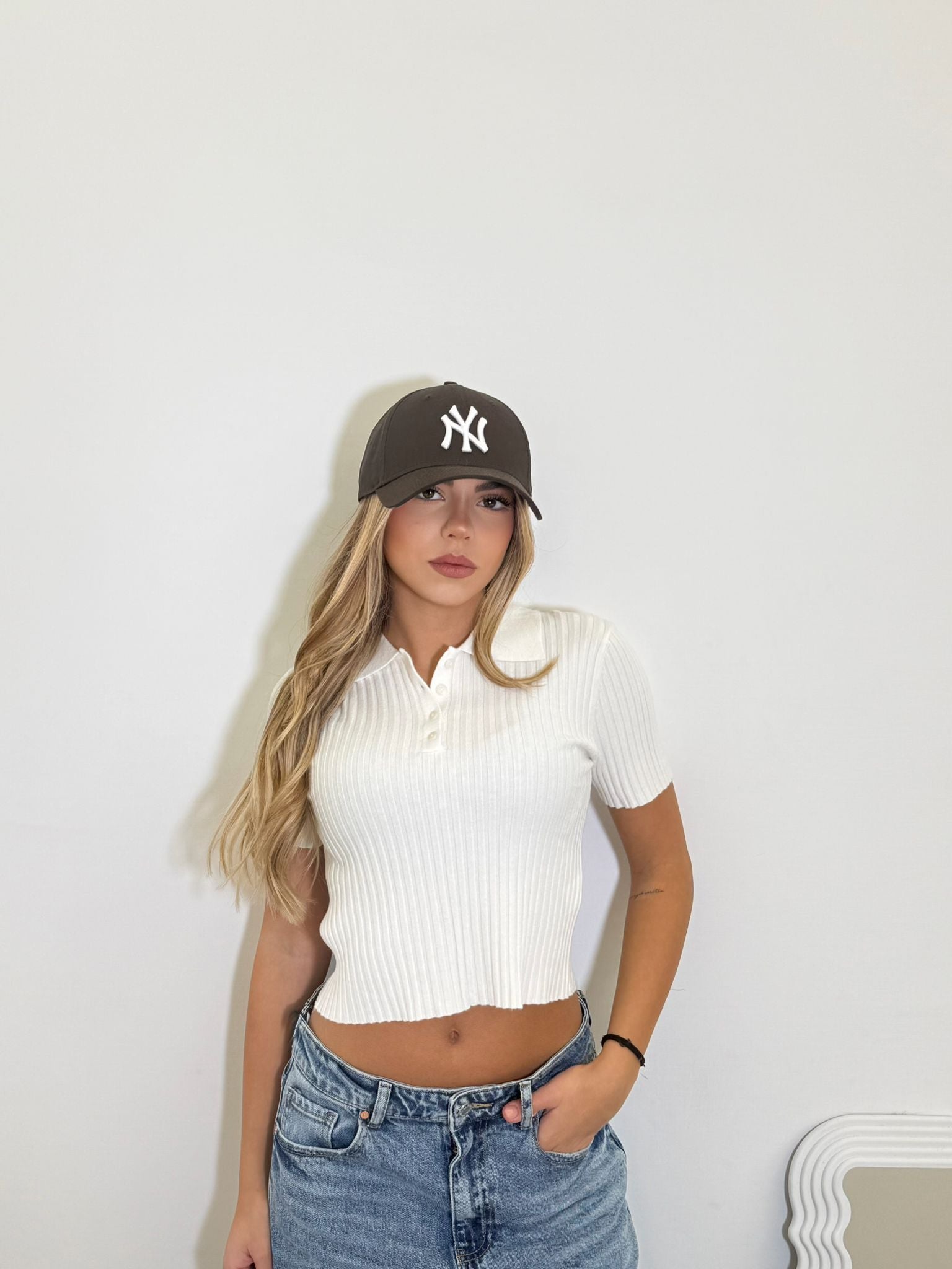 Mglietta crop top in simil cotone a costine, simil polo con colletto e bottoncini.