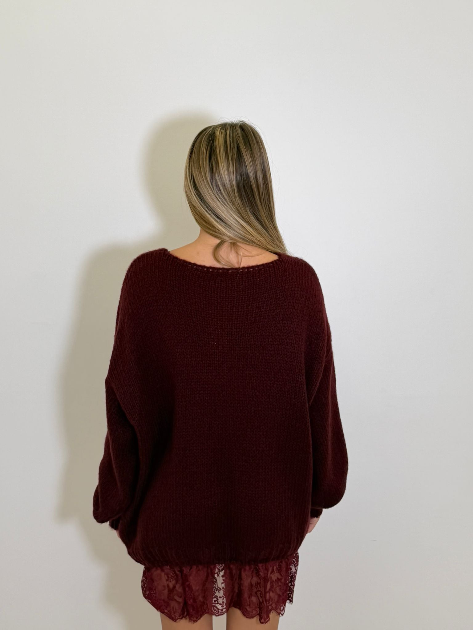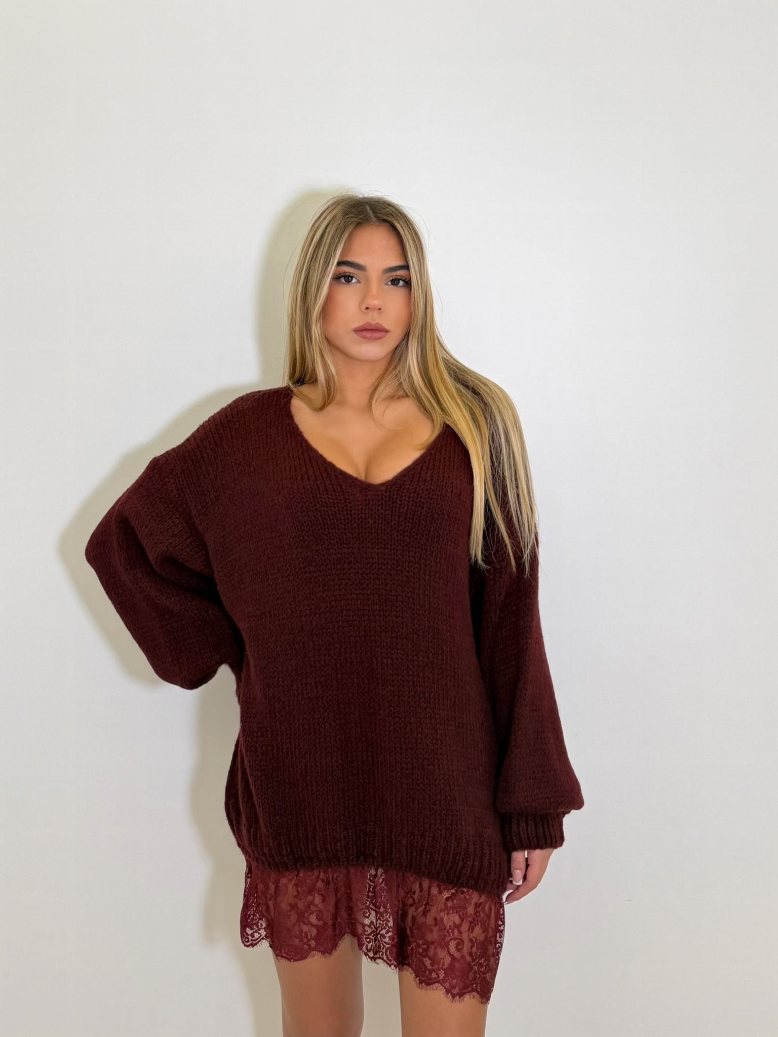 Maglione over in simil lana morbida bucherellato con scollo a V e con pizzo.