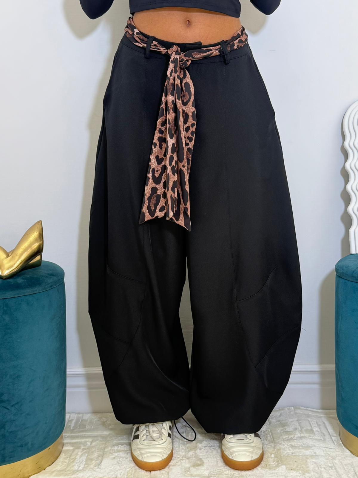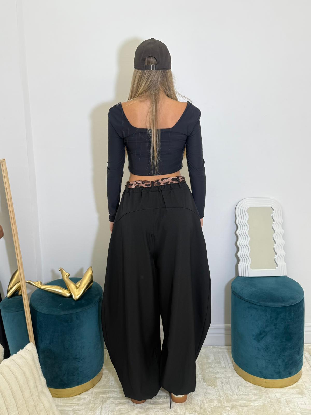 Pantalone gamba ampia con dettaglio cintura in stoffa maculata.
