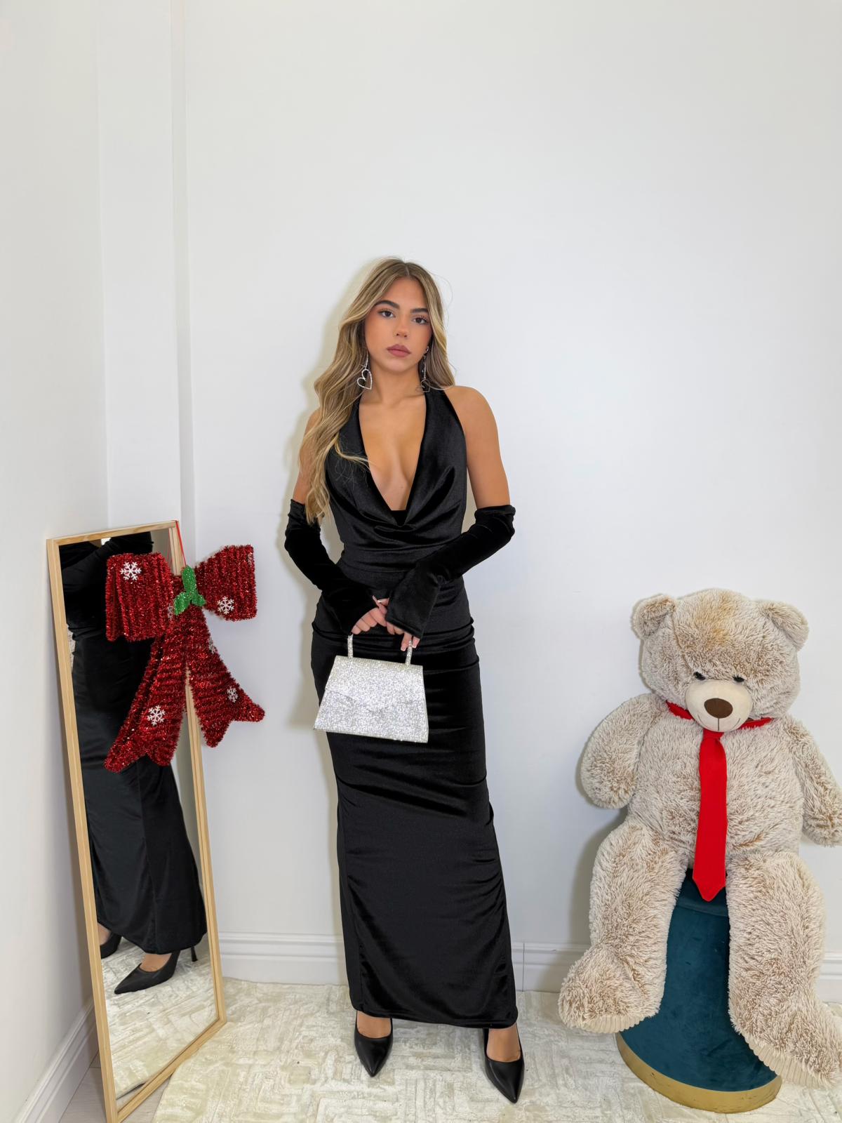 Abito lungo in simil velluto elastico con scollo all'americana e guanti.